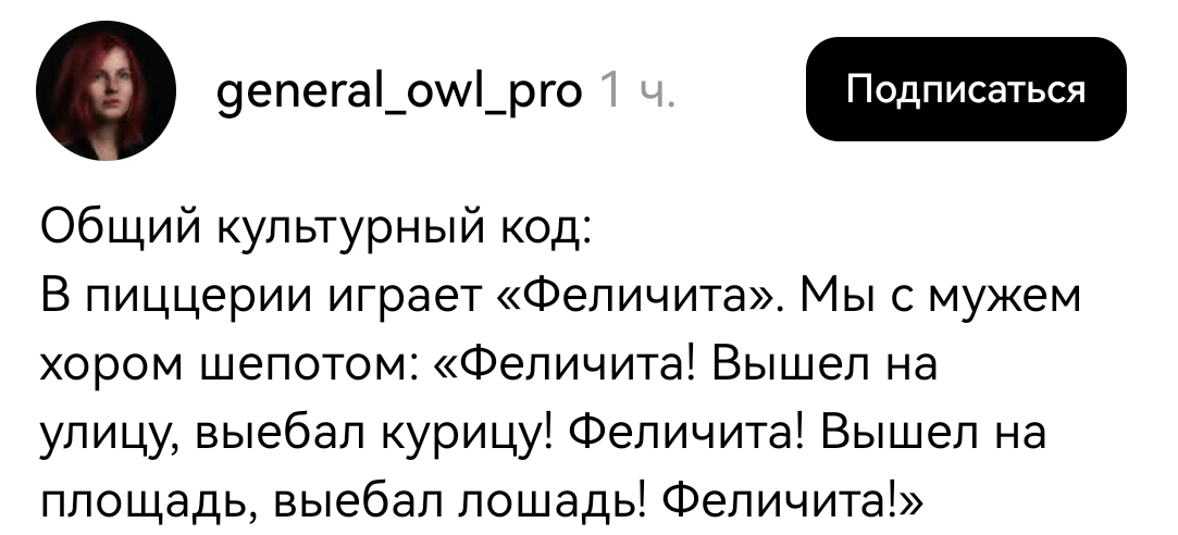 301 supasheff Юмор Культурный код 5 часов назад Скриншот Комментарии Юмор Песня Феличита Длиннопост Мат Threads 58 22 2 1 Ещё 0