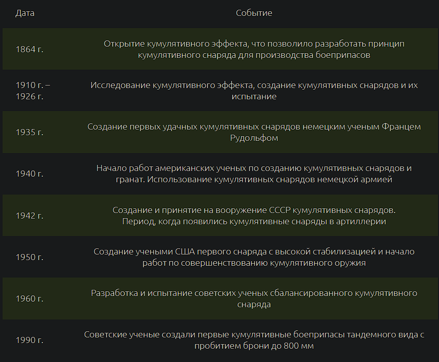 В 1864 году военный инженер М. Бересков (он стал первым, кто придумал кумулятивный снаряд) открыл кумулятивный эффект, после чего начал испытание и применение разработок в разрушении твердых объектов. Военные были поражены, как действует кумулятивный снаряд на бронированную технику. Именно с этого момента западные ученые начали исследование данного эффекта. С 1910 по 1926 годы продолжались исследовательские работы и создание разнотипных кумулятивных снарядов и мин. Целью этих опытов было нахождение правильной формы и материла, которые в совместном использовании могли пробивать объекты, имевшие большую толщину бронирования. В 1935 году молодой немецкий ученый начал работы по созданию кумулятивных артиллерийских снарядов, которые активно использовались в начальном этапе Второй Мировой войны. Увидев потенциал кумулятивных снарядов, советские ученые на примере немецких боеприпасов начали разработку и производство собственного оружия. В 1942 году кумулятивные советские снаряды начали использоваться на артиллерийском оружии калибра 76 и 122 мм.