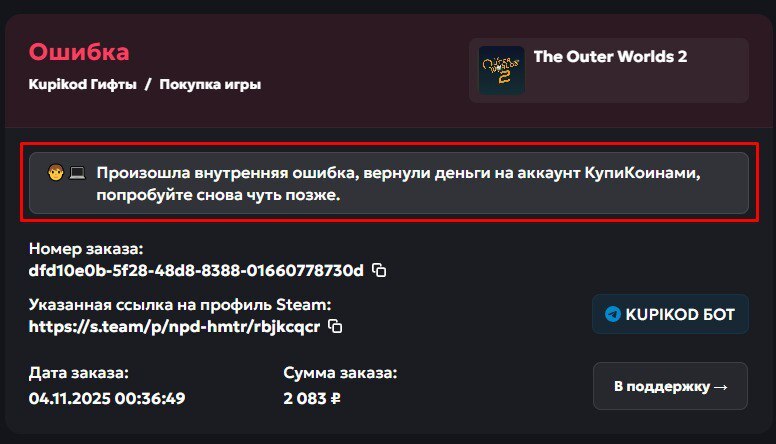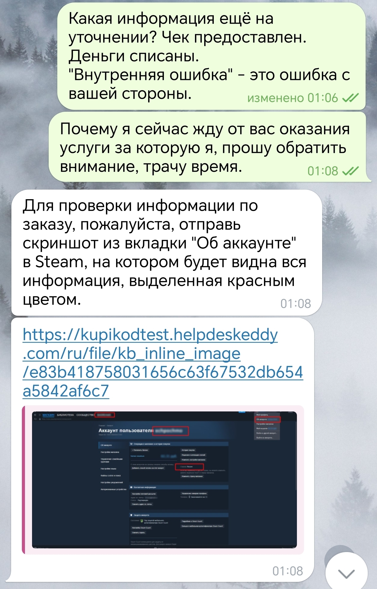 Здесь и начинается трагедия всяких Васянов, Стосянов, любителей сэкономить и моя, когда заветный гифт так и не пришёл, а ТП (вроде и не маленькой конторы) по несколько часов/дней/недель отвечает на, казалось бы, банальное "Возврат средств, если ошибка произошла на стороне вашего сервиса и услуга не была оказана".