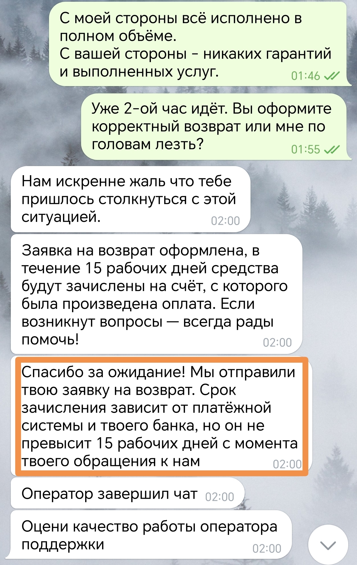 Оплата произошла по СБП (система быстрых платежей) и, по традиции, возврат должен происходить так же, либо в выбранном мной, а не продавцом, эквиваленте. Но вместо этого я получаю скупое "до 15 рабочих дней", отсутствие гарантий возврата и крутящуюся в голове фразу мужчины, что подскольнулся в магазине связи.