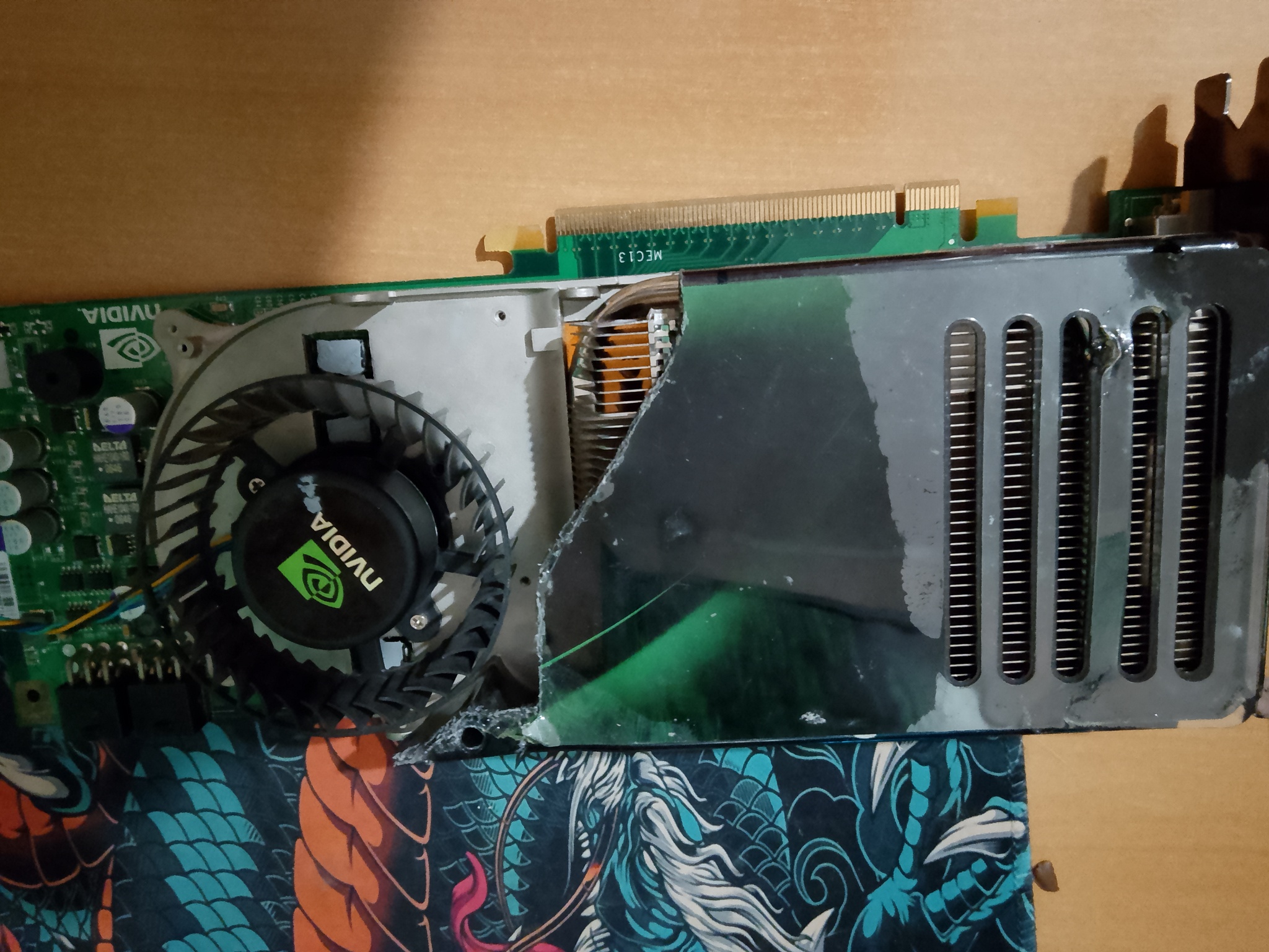 И ради чего я весь этот хлам купил: GeForce 8800 GTX! Самая топ видяха того времени, круче нее была только 8800 Ultra, которая была, по сути, разогнанной GTX. Кусок пластика оторван, но изображение выдает, нормально протестировать пока не успел, нет лишнего жесткого диска чтобы подкинуть.