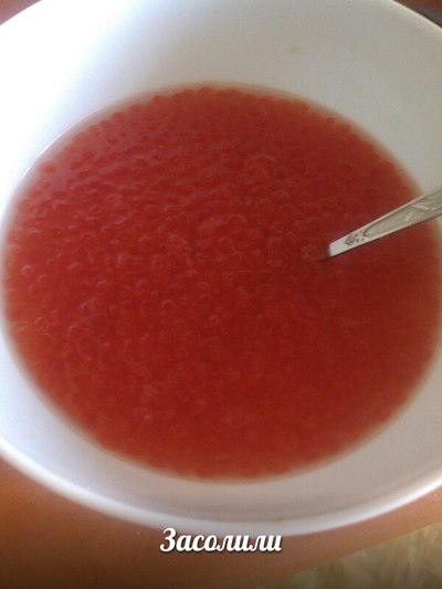 1.) Очищаем икру от пленочек. Самый сложный и нудный процесс. Нужно аккуратно отделить зернышки икры от пленок. Икра довольно таки мягкая и ее легко раздавить. Поэтому собираем всю свою аккуратность и тщательно, долго и нудно, фактически по икринке отделяем зернышки. Кстати говоря, не вздумайте промыть икру под краном, не знаю причин, но икра не переносит контактов с пресной водой. икра становится жесткой и противного серого цвета. 2.) Делаем крепкий раствор соли. В емкость наливаем горячую кипяченую воду и добавляем туда соль. Крепость определяла следующим образом: кусочек картошки должен плавать на поверхности. Рассол остужаем. Я просто оставила на ночь. 3.) Засолка икры. Икру аккуратно перекладываем в холодный раствор соли и помешиваем ложечкой. Икра должна находится в рассоле не более 5 минут, иначе она станет ооочень соленой. Если икра не очень крупная, то достаточно и 3 минут.