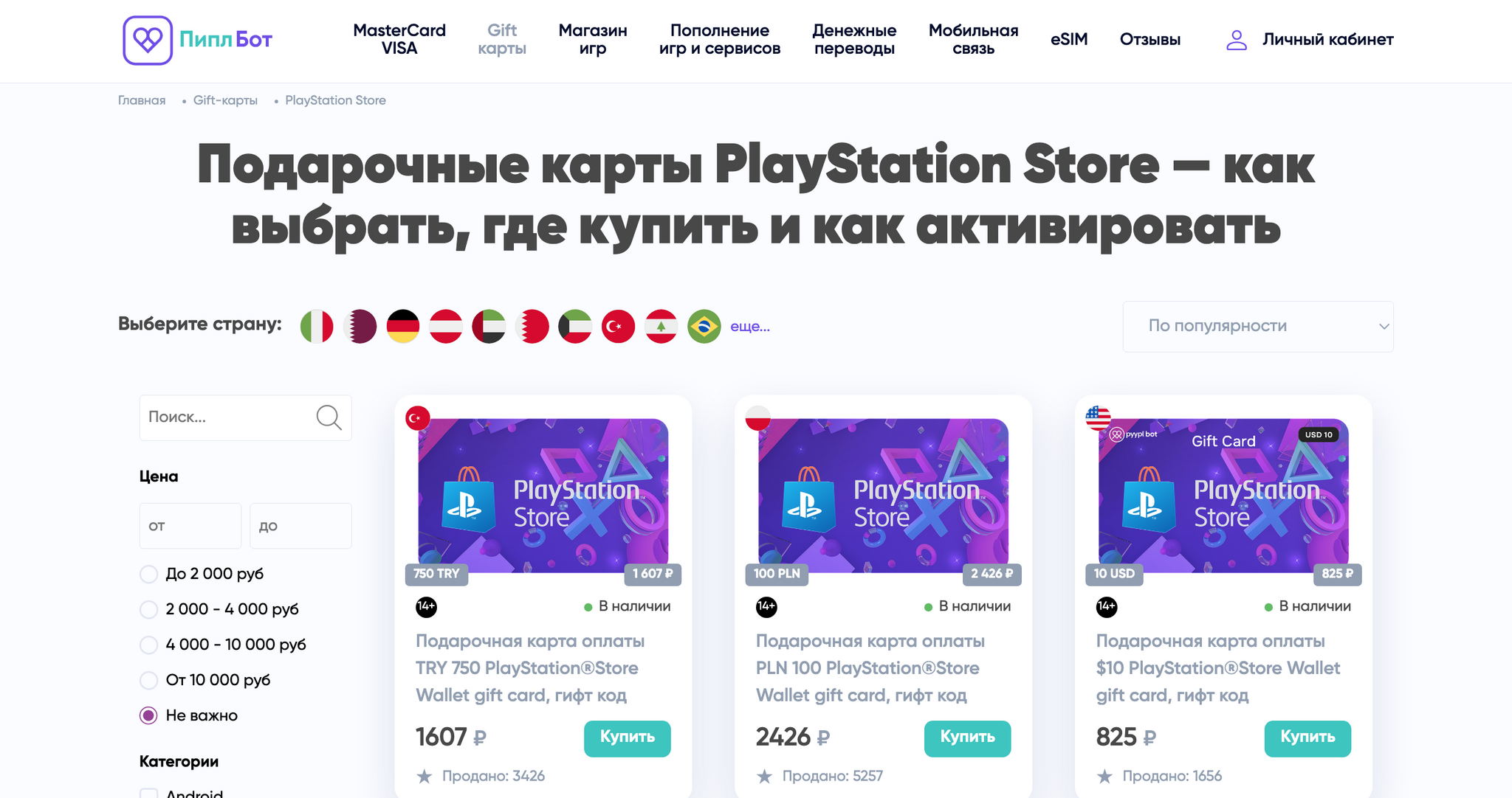 Подходит, если нужно купить подписку PSN или оформить пополнение в редком регионе.