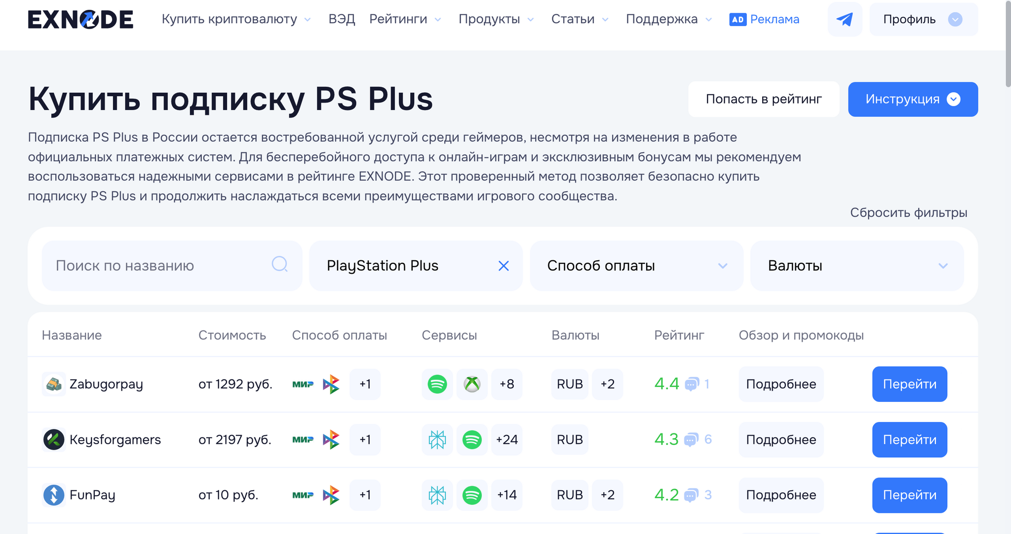 Чтобы быстро сравнить цены и подобрать оптимальный вариант, удобно использовать Exnode — там собраны проверенные сервисы, такие как Zabugorpay, Keysforgamers и FunPay, где можно безопасно оформить подписку, выбрать выгодный регион и получить активацию без сложных настроек. Такой подход позволяет и сэкономить, и сохранить полный доступ ко всем возможностям подписки PlayStation Plus.
