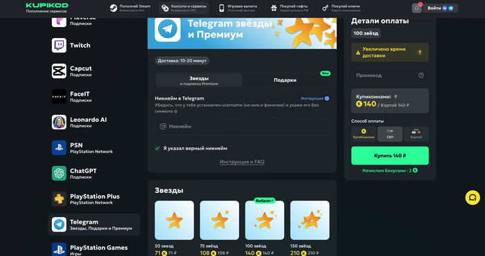 КупиКод — удобный сервис, через который можно купить звезды Телеграм в России с минимальной суммой от 70 рублей. Площадка поддерживает оплату банковскими картами МИР и Visa, а также СБП.