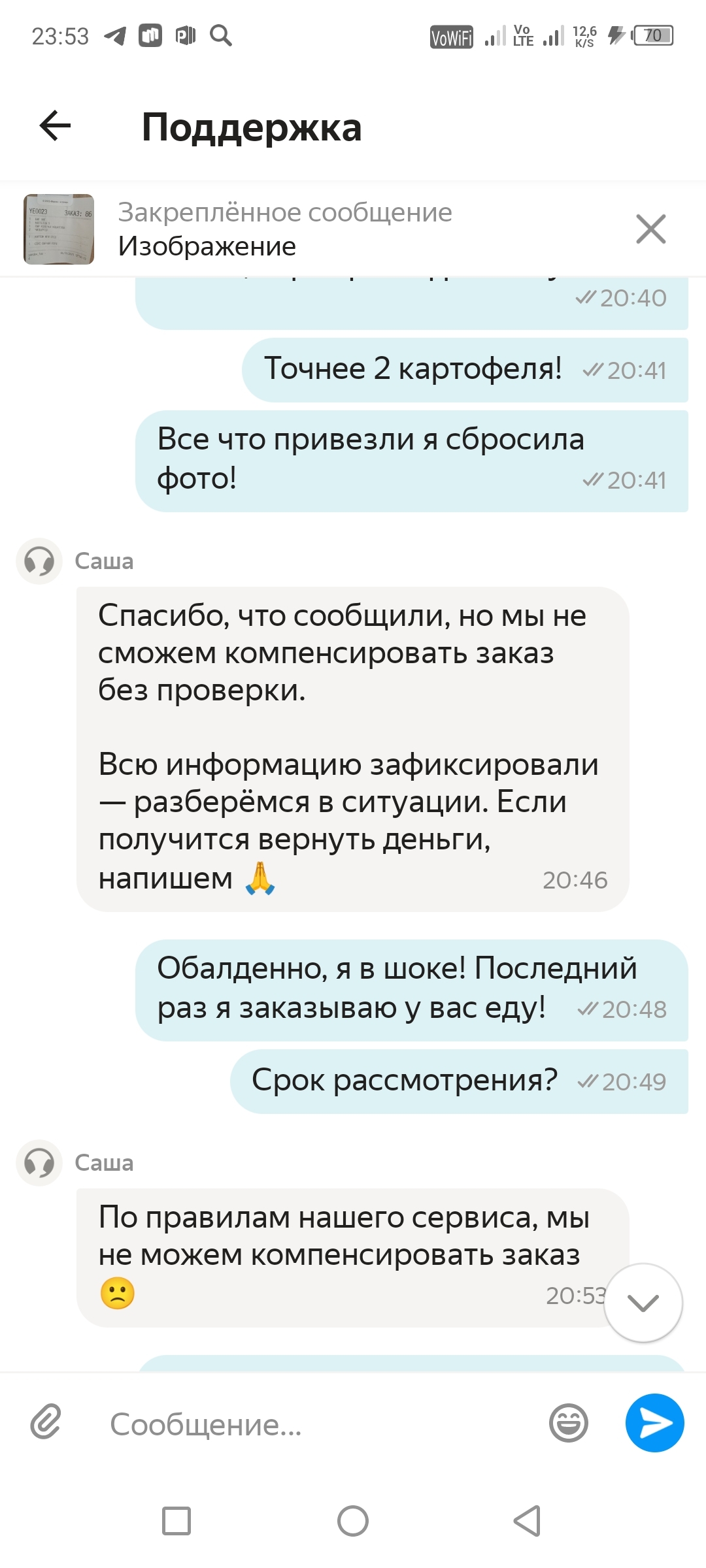 Прошу @Yandex.eda, решить мой вопрос в рамках досудебного урегулирования, в противном случае оставляю за собой право обратиться в Роспотребнадзор.