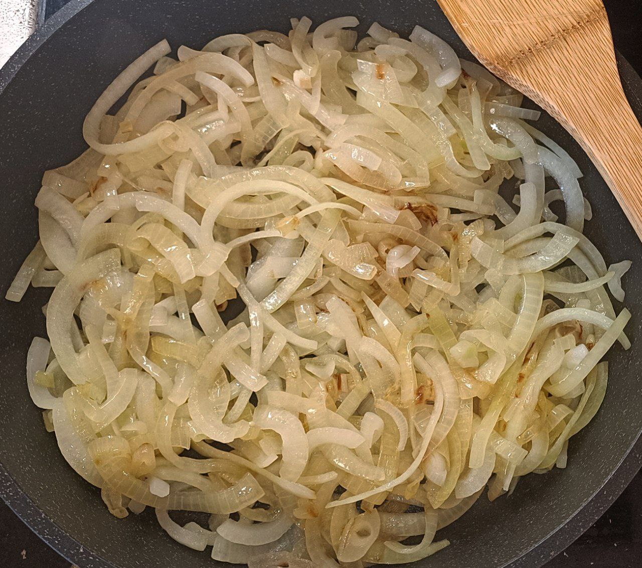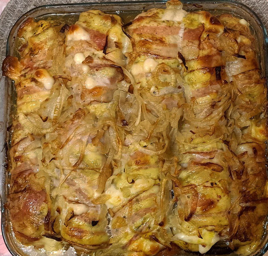 На овощи сверху выкладываем филе в беконе. Сверху и между кусочками курицы закладываем обжаренный лук.