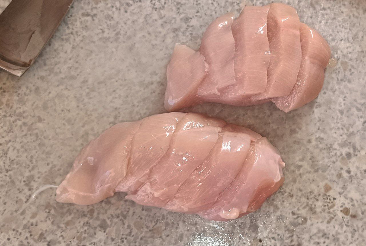 Куриную грудку моем, делим на порционные куски и делаем надрезы.