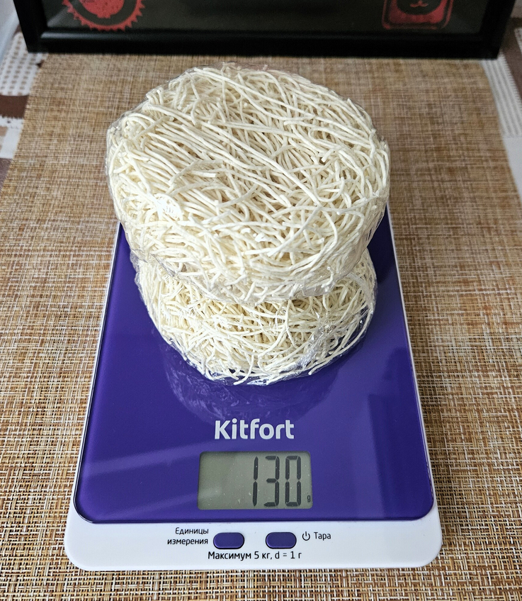 Тонкая и бледная пшеничная лапша. Вдвоём брикеты тянут на 130 граммов.