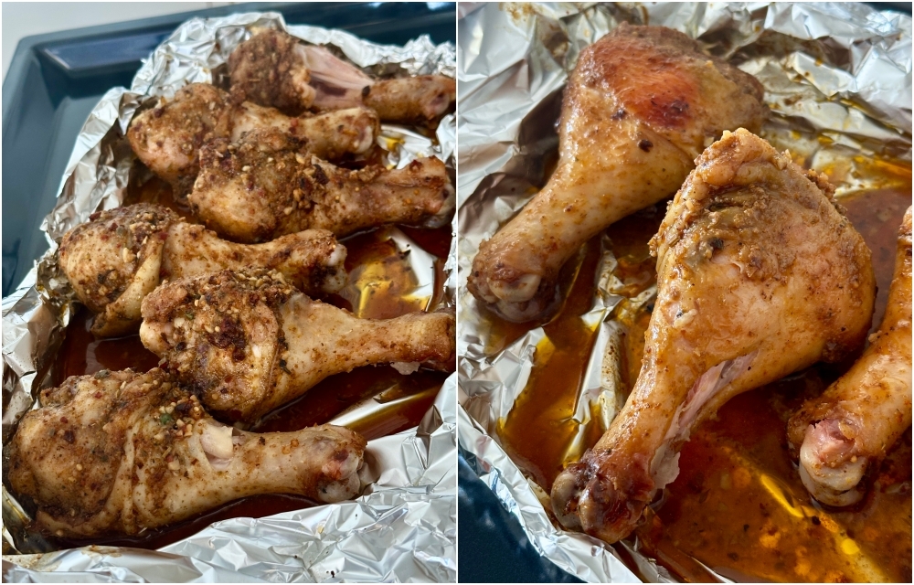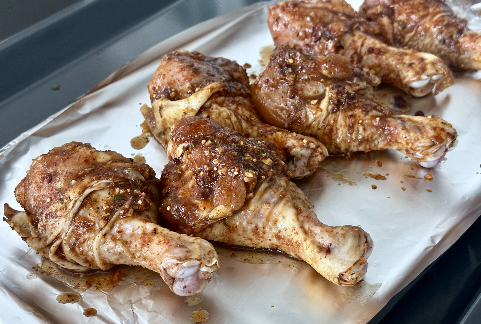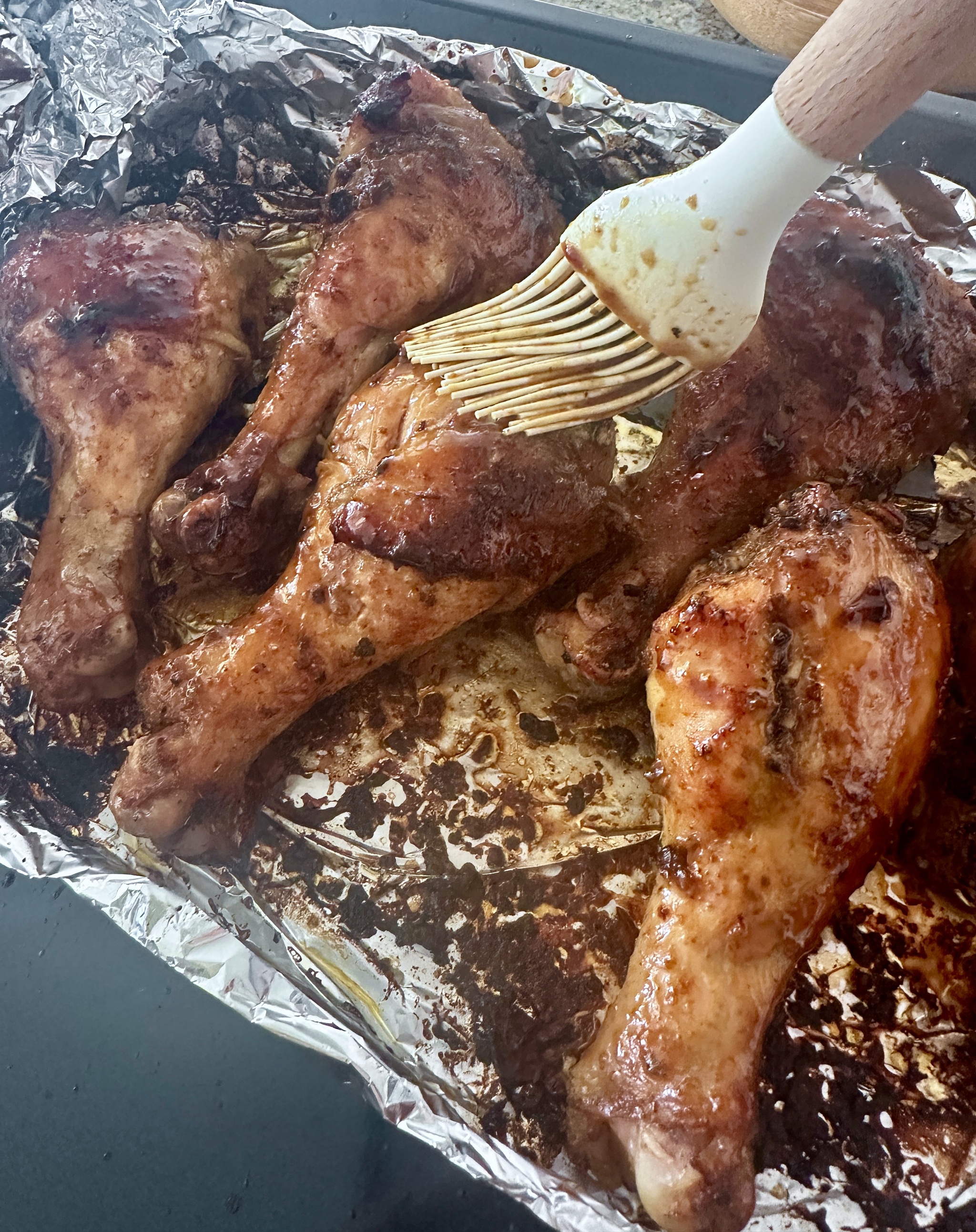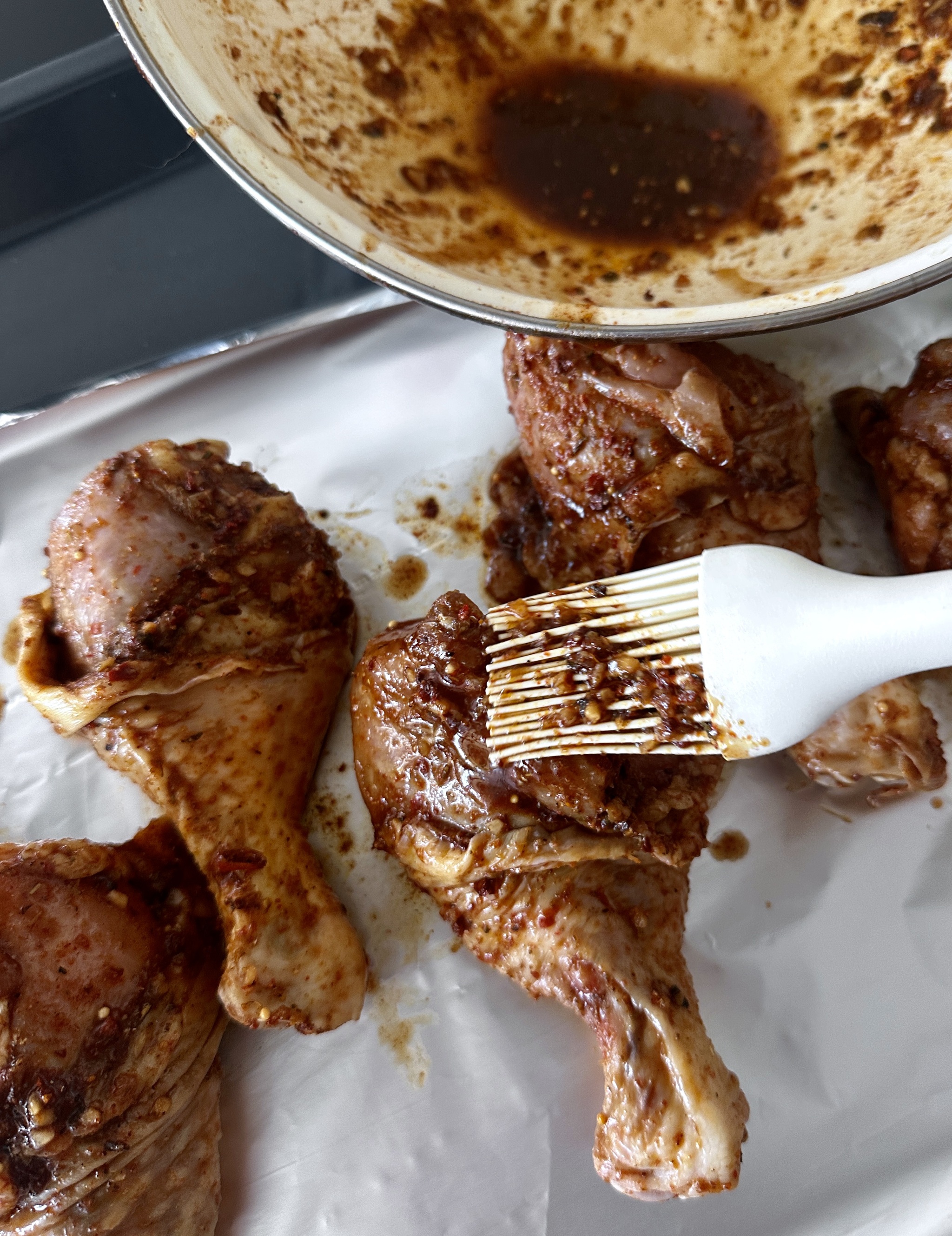 Застелил противень фольгой и выложил ножки рядком. Остатки маринада кисточкой по ним размазал.