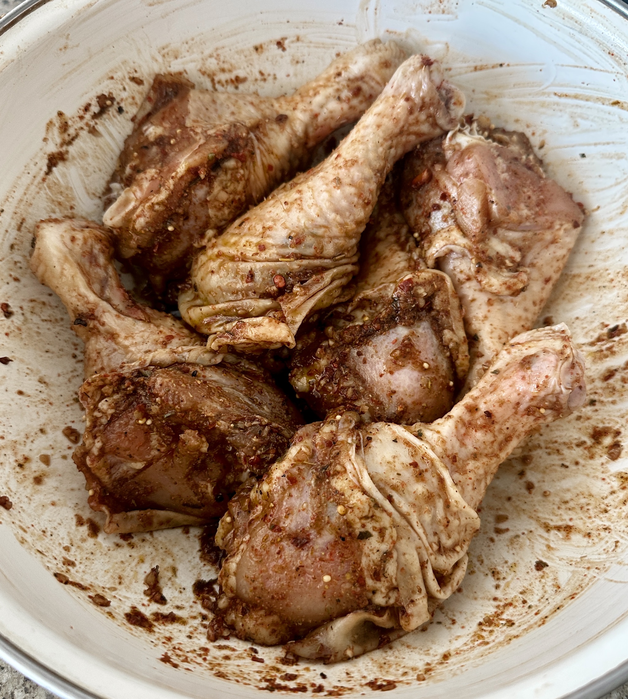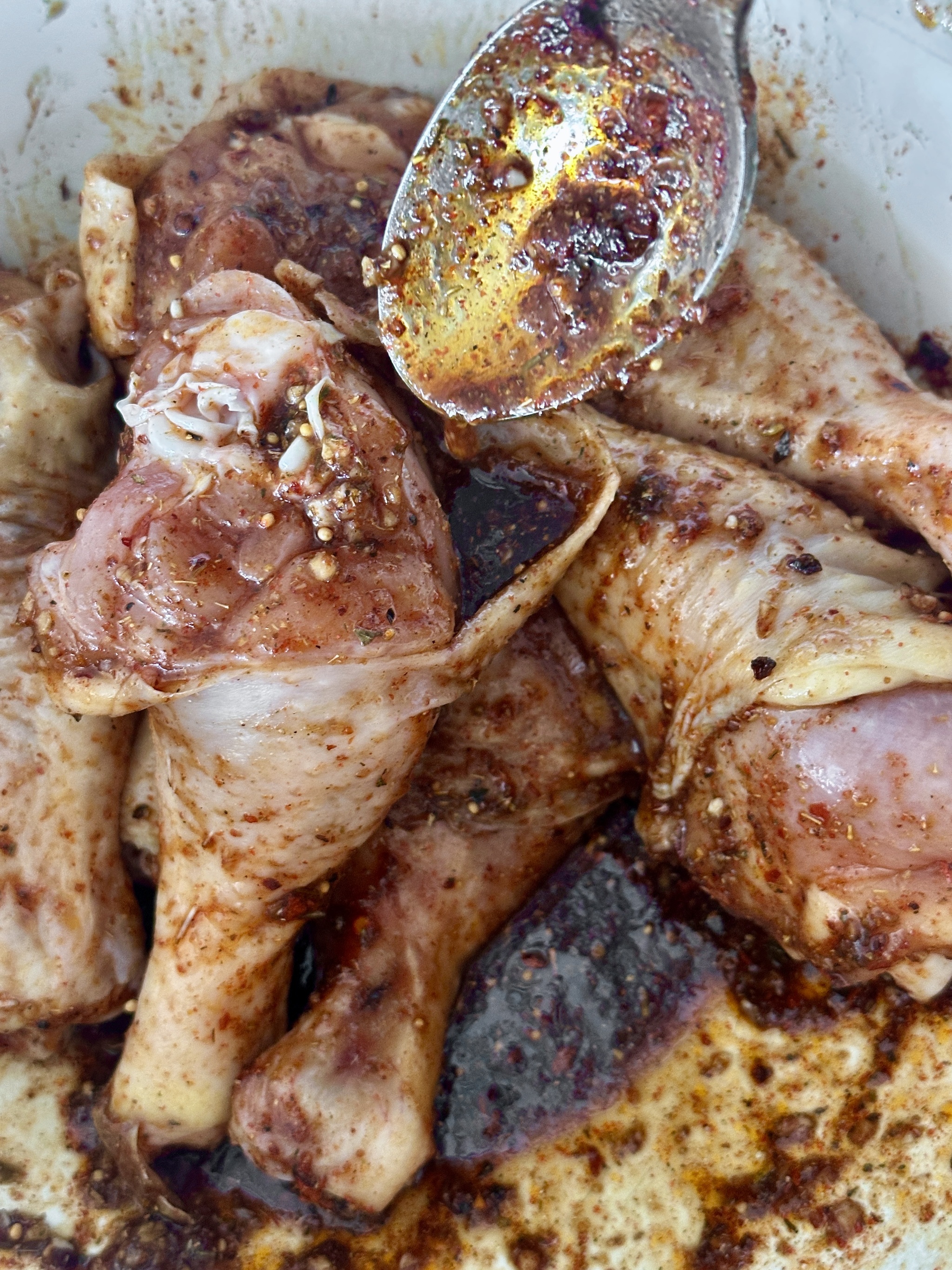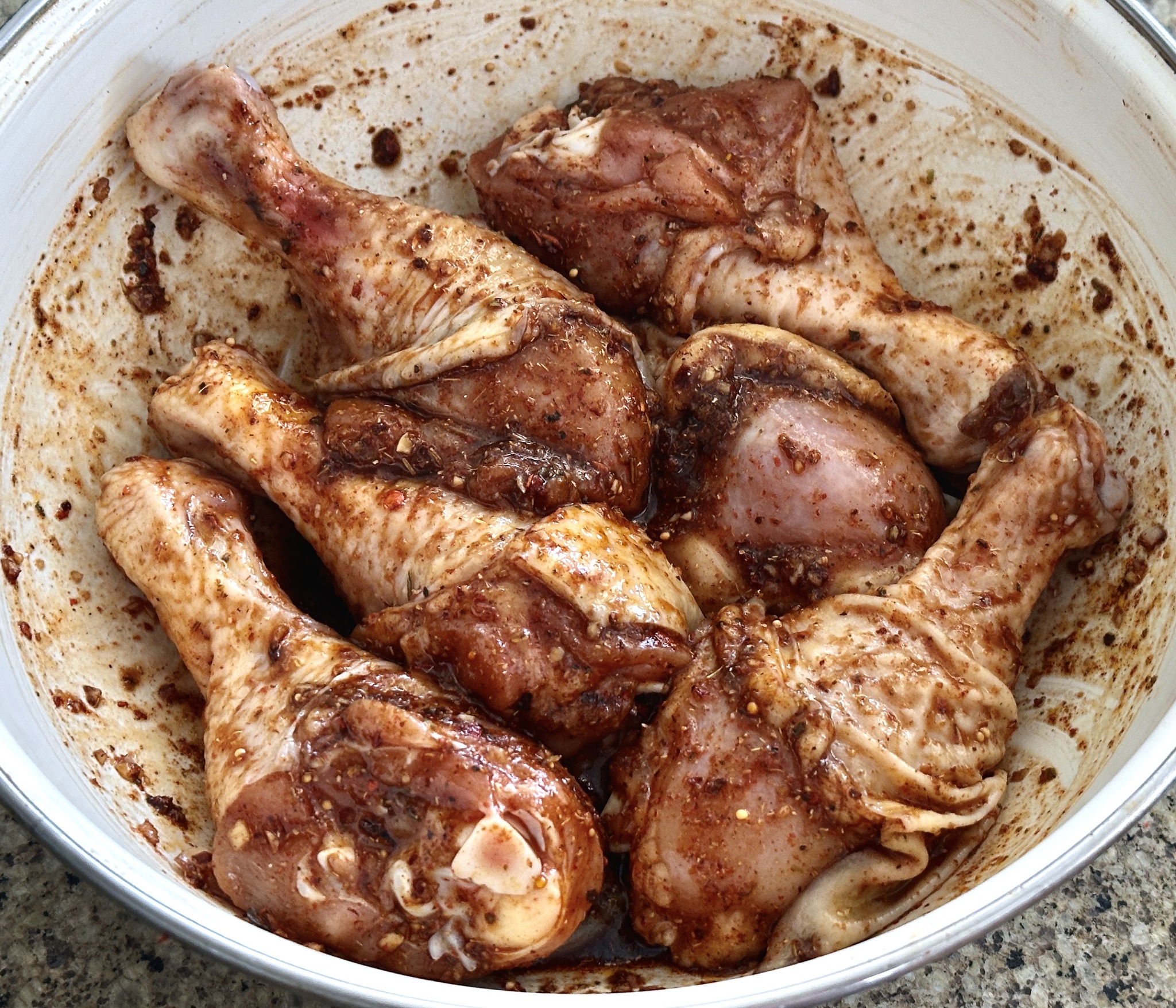 Залил маринад в тазик с курицей. Перемешал. А потом в каждую ножку под шкурку, что называется, вложил маринада и эдак помассировали, чтобы все вкусности-полезности под шкуркой проникли поширше и поглубже.