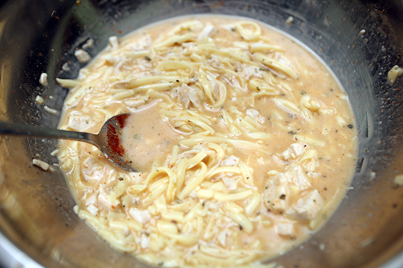 Сыр крупно натираем (можно использовать терку для корейской моркови) и добавляем к смеси из яиц. Заранее отваренное куриное филе нарезаем мелкими кубиками и также добавляем к общей массе. Посыпаем специями и перемешиваем, чтобы они равномерно распределились по всему объему.