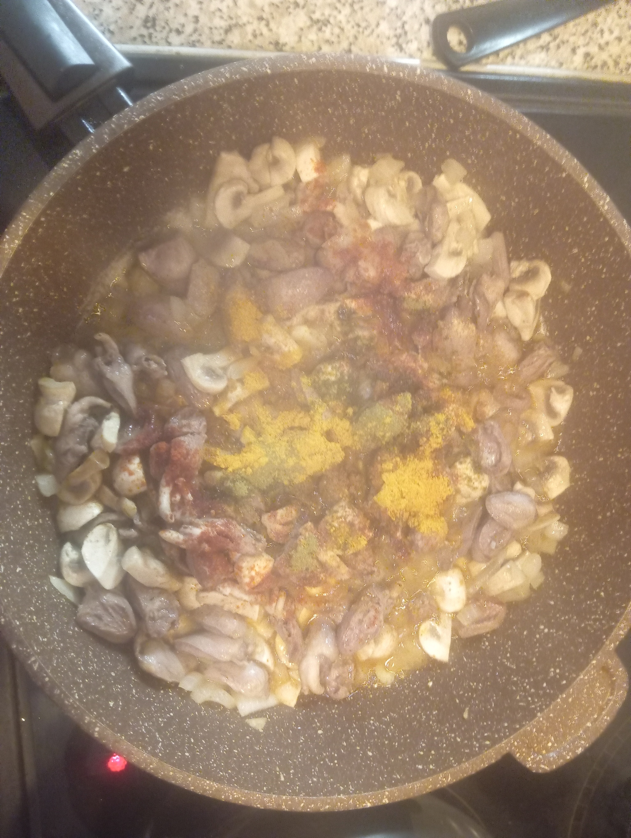 5. После специй поэтапно, перемешивая добавляем в следующем порядке: горчицу, кетчуп, сметану, тушим перемешивая 3 минуты и добавляем стакан кипятка. Накрываем крышкой, убавляем огонь на минимум, засекаем 20 минут и снимаем с плиты.