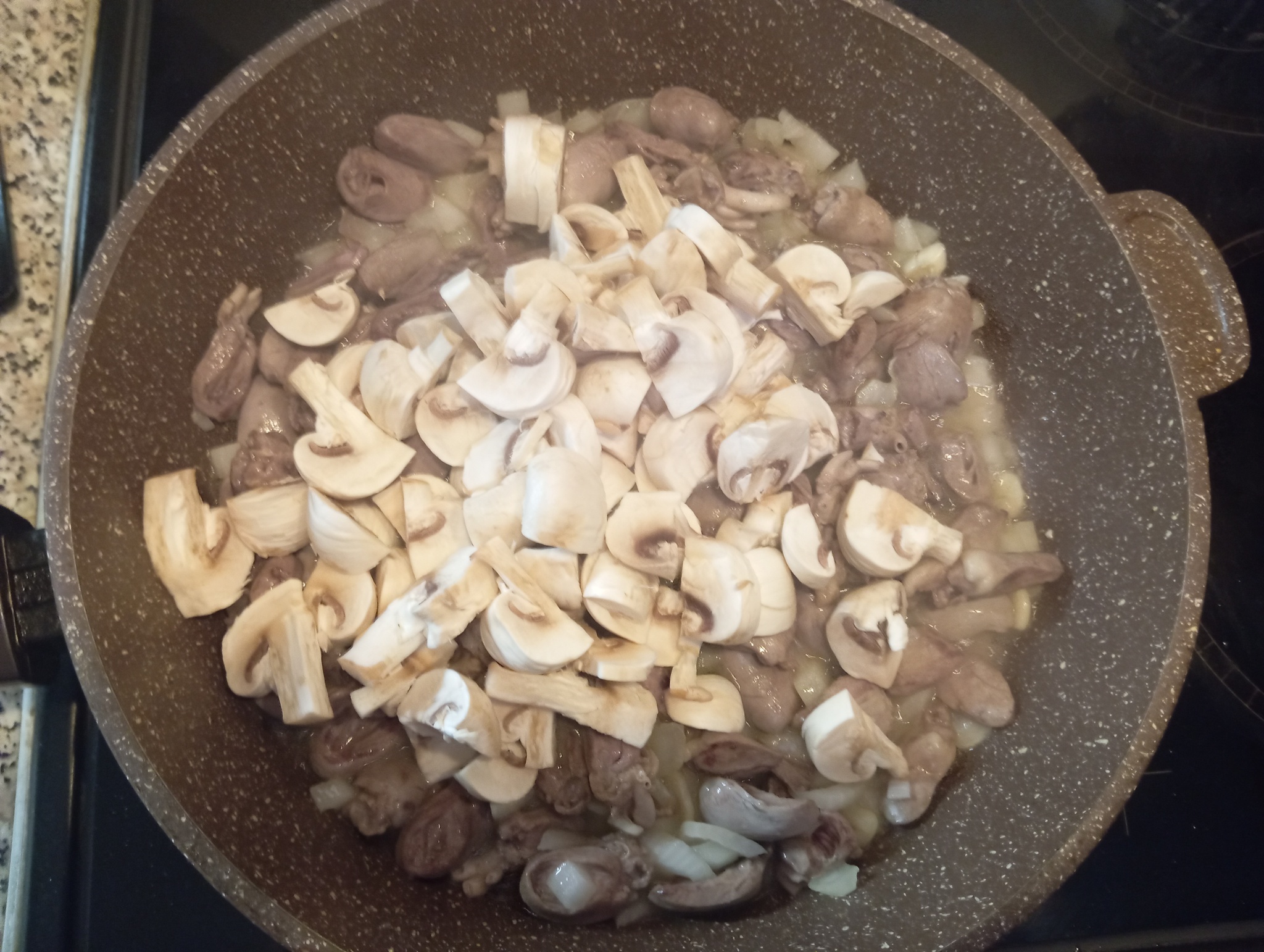 Мелко режем лук и чеснок (кубиками и пластинами), затем отправляем к уже жарящимся 2 минуты сердечкам, перемешиваем и обжариваем ещё 3 минуты;