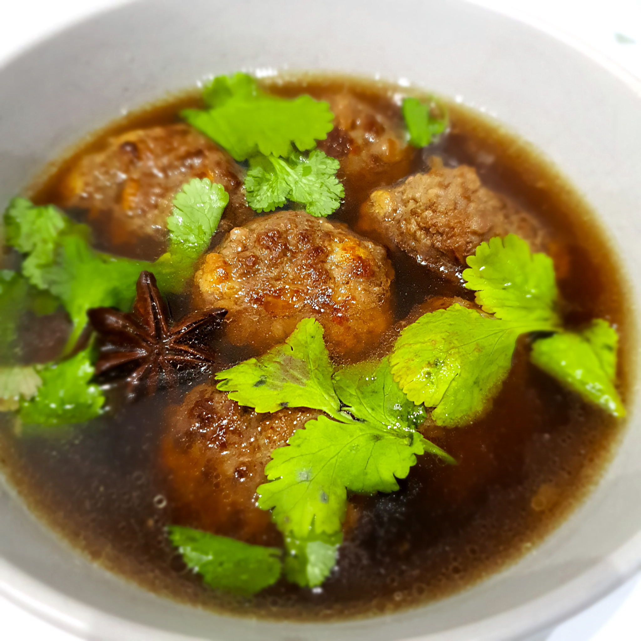 Бульон уже закипел. Добавляю в него оставшийся порубленный имбирь, пару ложек соевого соуса, пару ложек устричного соуса, пару звездочек аниса, немного хлопьев сушеного перца чили и чуть свежемолотого чёрного. Пусть теперь кипит на слабом огне, набирает вкус, минут 10, пока будут жариться фрикадельки.