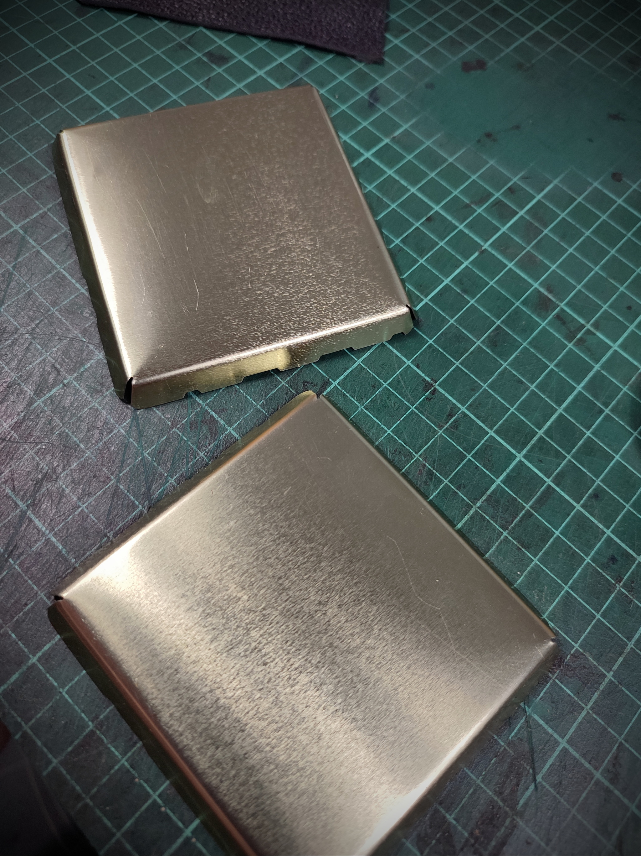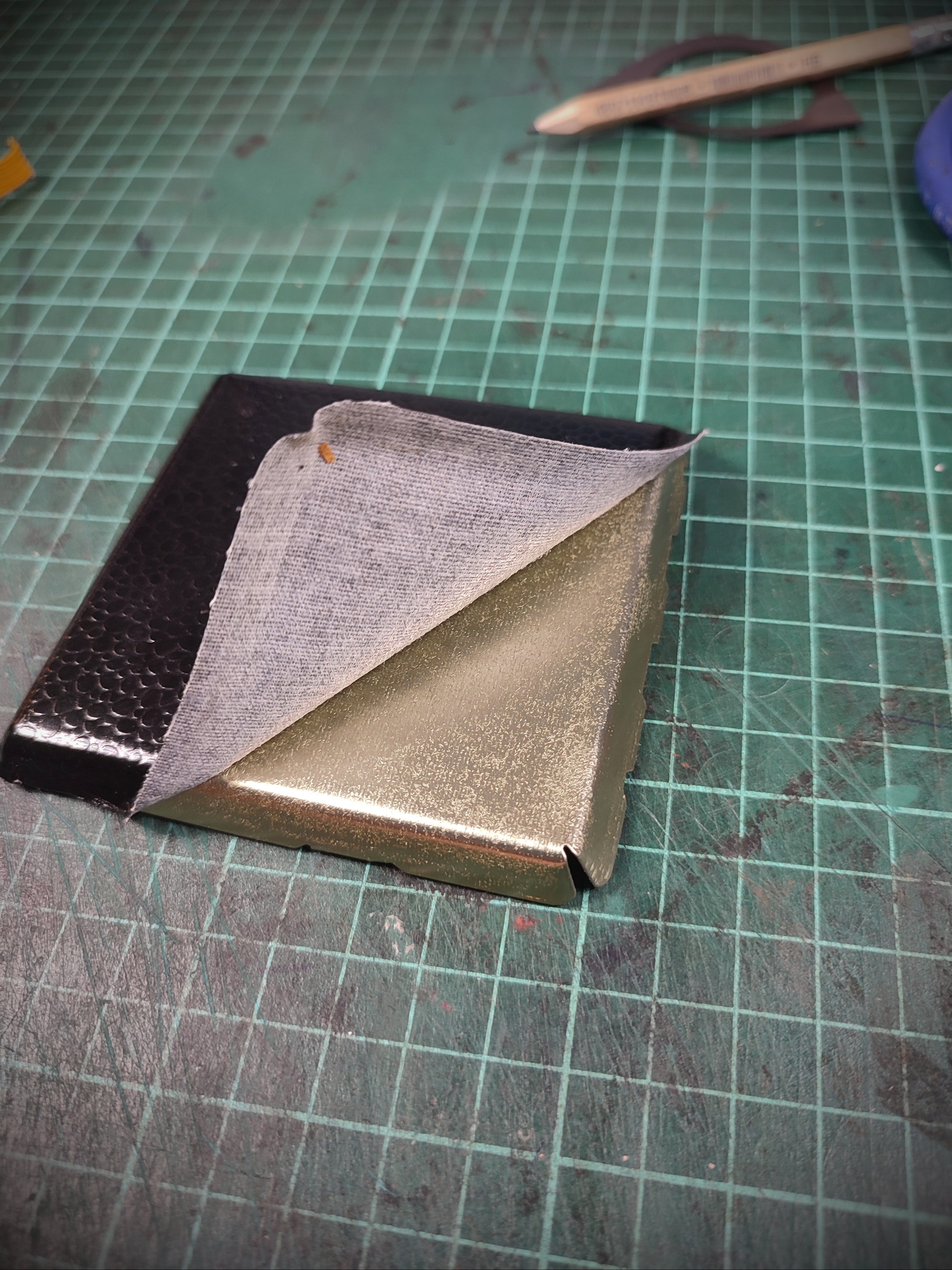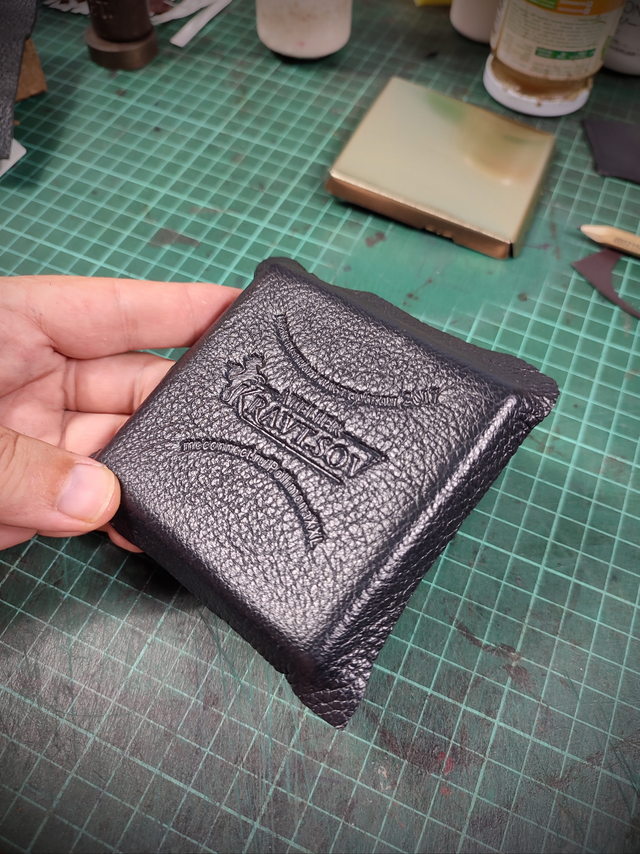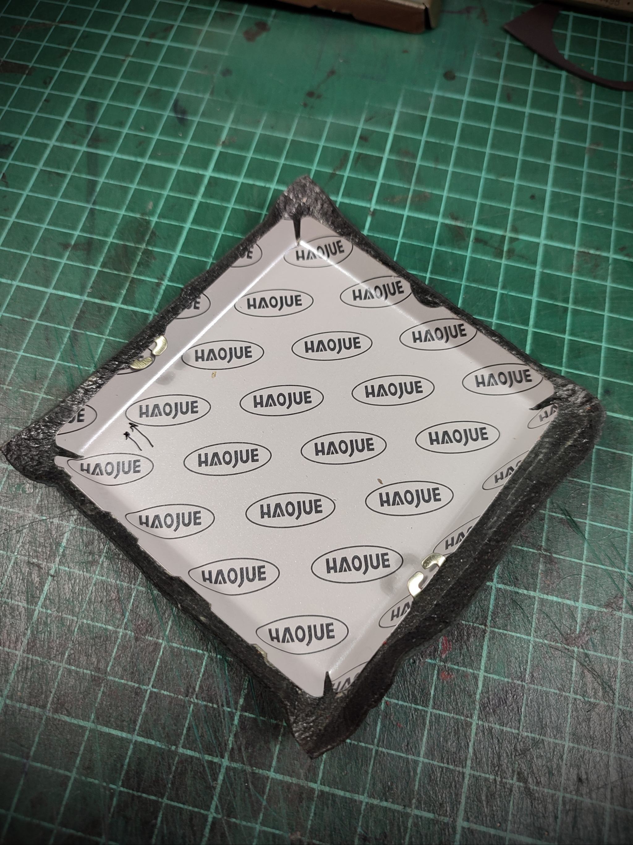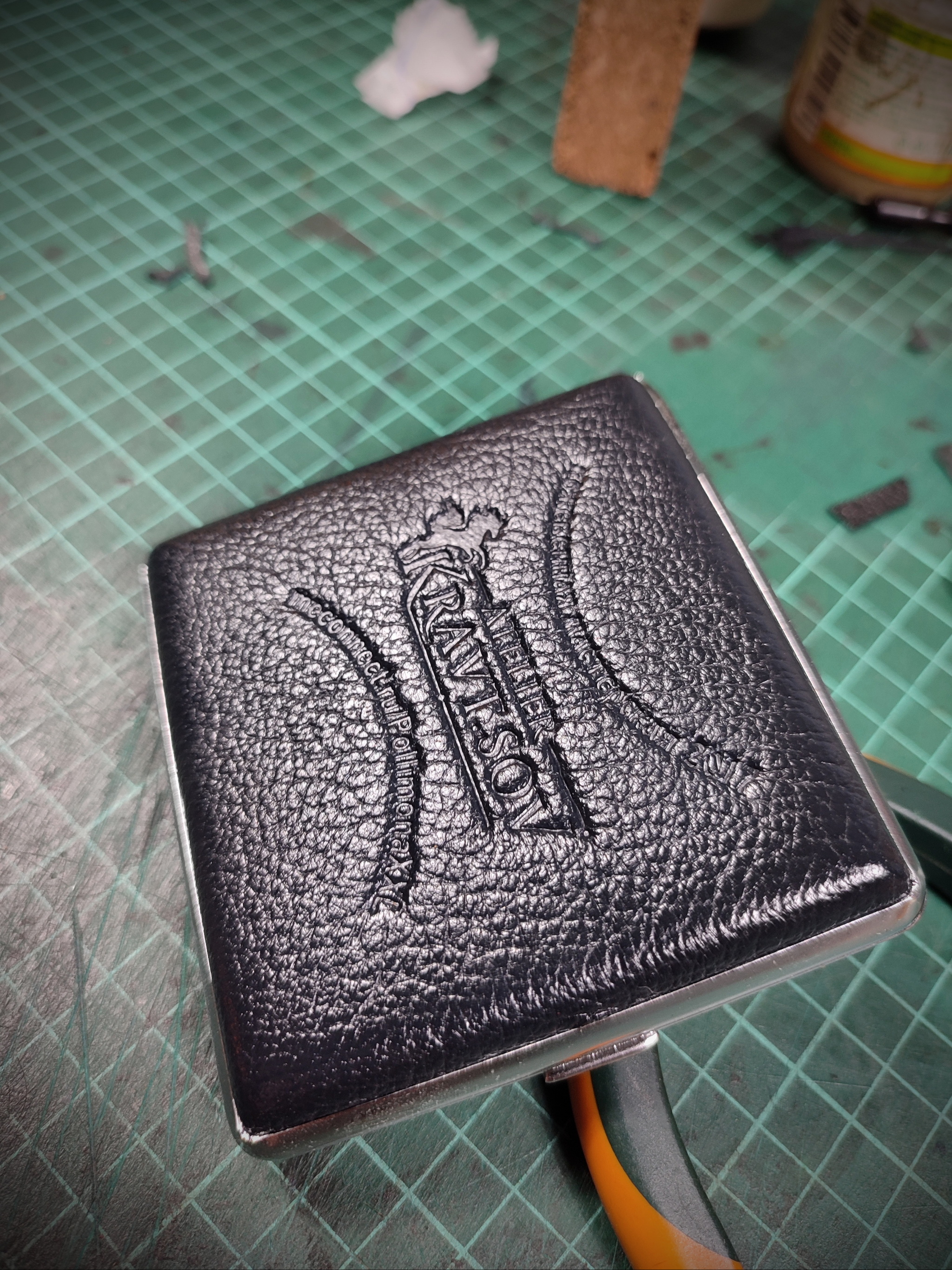 Плотненько натягиваем кожу на основу, особое внимание уголкам, чтобы не было складок и пузырей. Клей злой - сдернуть с него кожу уже не получится. Получаем это: