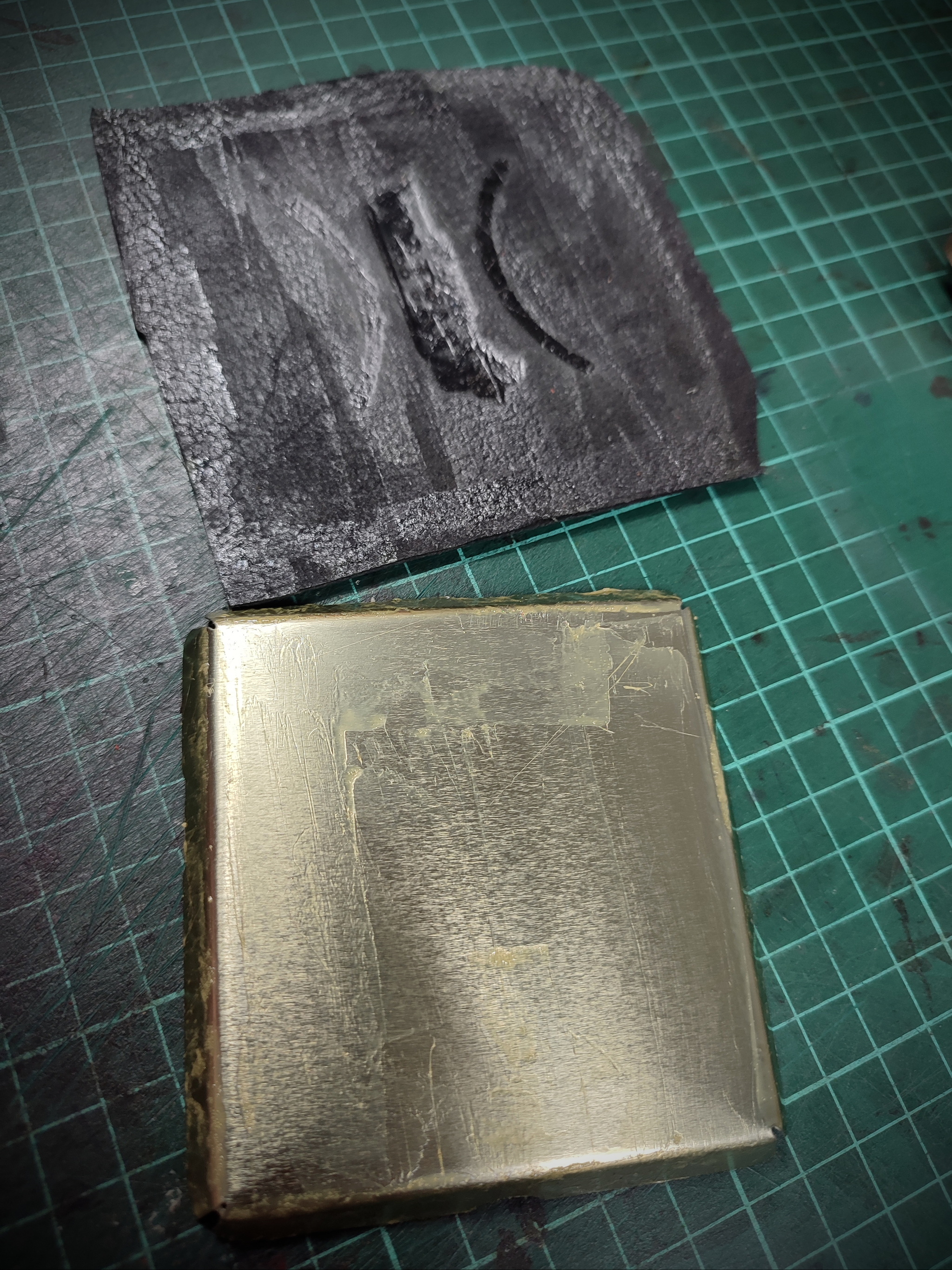 Берём остатки кожи, под рукой была черная коза, нарезаем нужные куски, один отправляем под пресс - посмотрим как давленка будет держаться на хромке, хотя что смотреть, ничего с ней не случится.