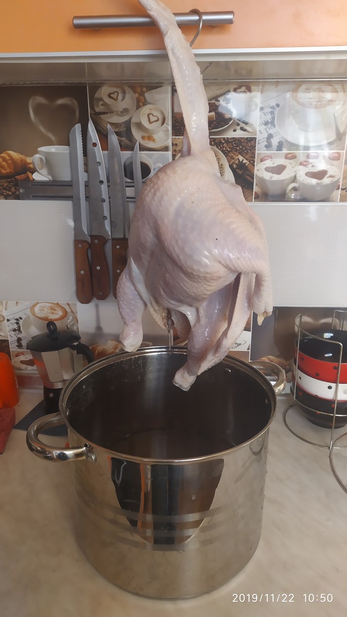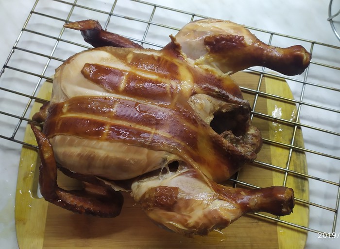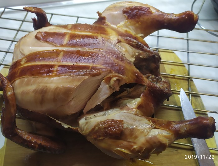 Курица получилась ароматной, вмеру соленой, сочной, слюна течет. Остывать и проветриватся будет около 2 часов, дальше ночевать в холодильник, а вот завтра мы ей ноги приделаем, хотя скорее наоборот)))