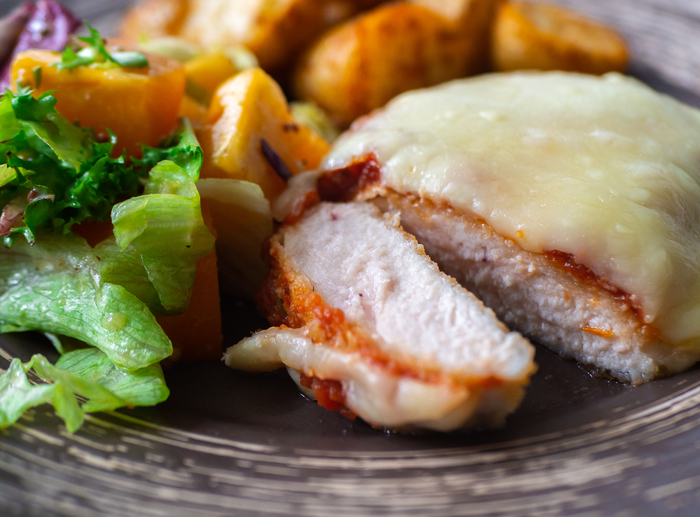 4. Выкладываем все кусочки обжаренного филе на противень, застеленный фольгой. Сверху на каждый кусочек по столовой ложке соуса, потом еще горку тертой моцареллы и в духовку при 180 градусах минут на 10-15, чтобы сырочек хорошо растаял и филе доготовилось.