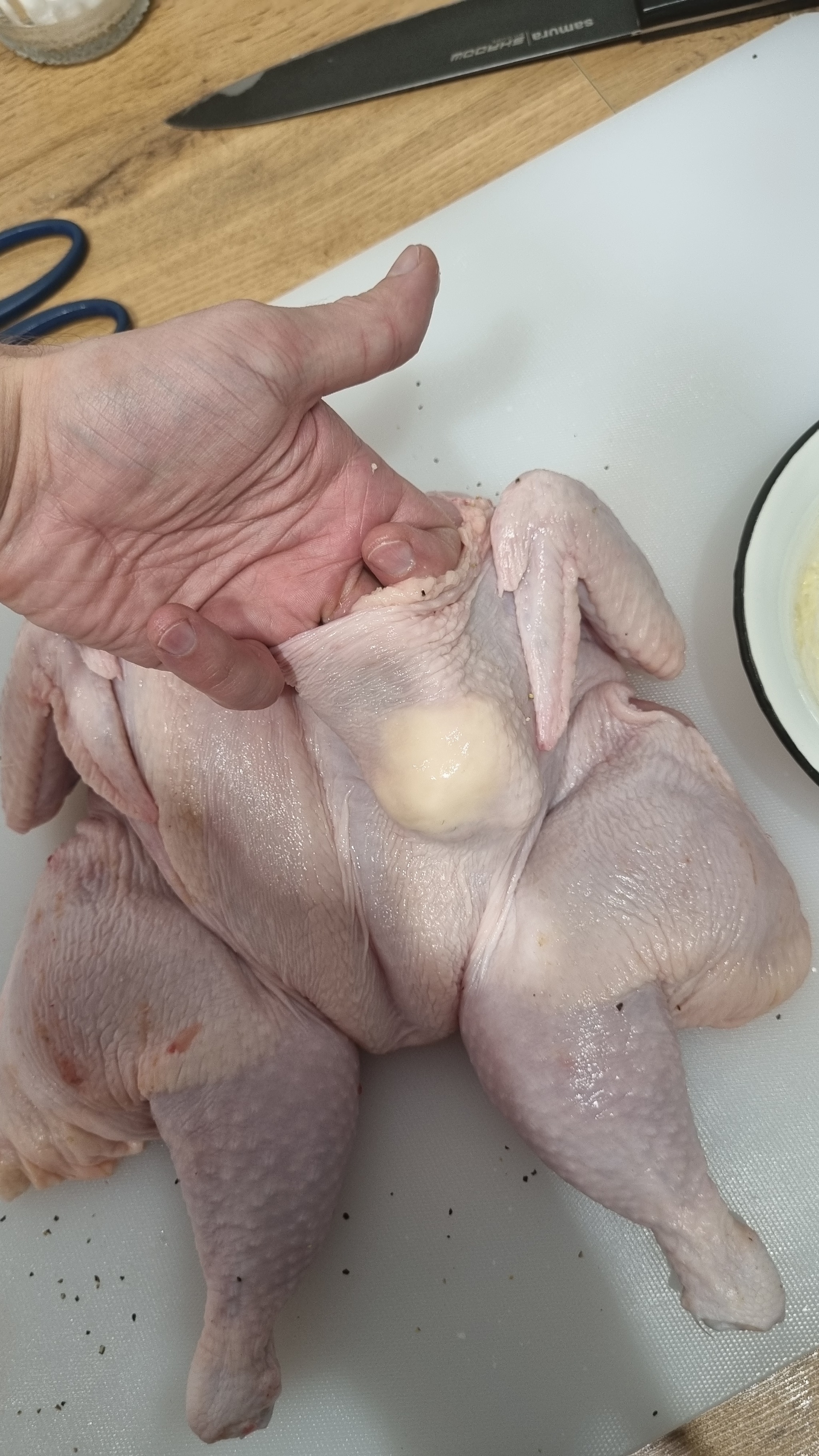 Далее нам нужно сделать надрез изнутри. Чтобы курица расплющилась как следует.
