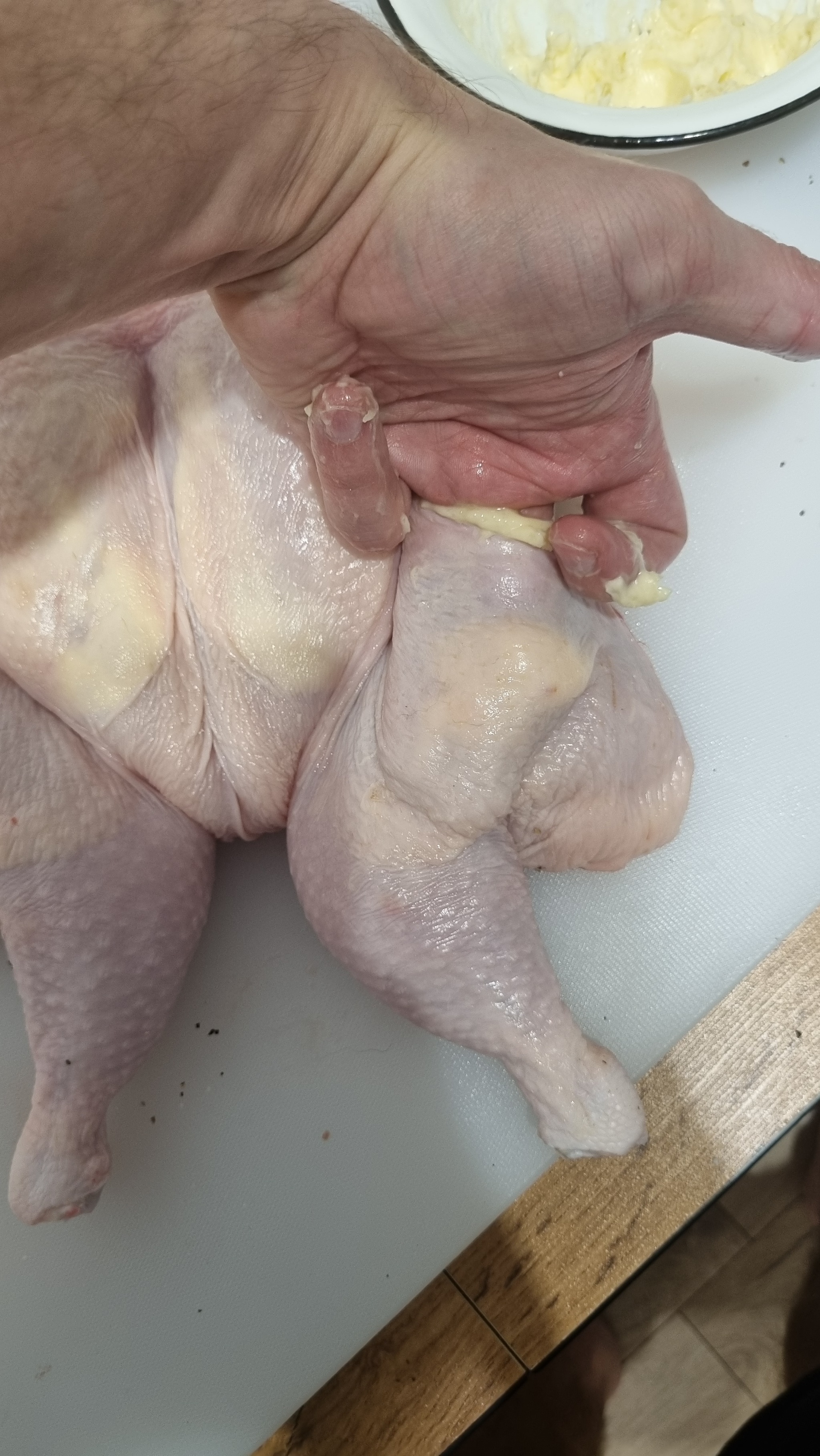 Сначала заправляем половину масла под кожу грудки. Вот так.