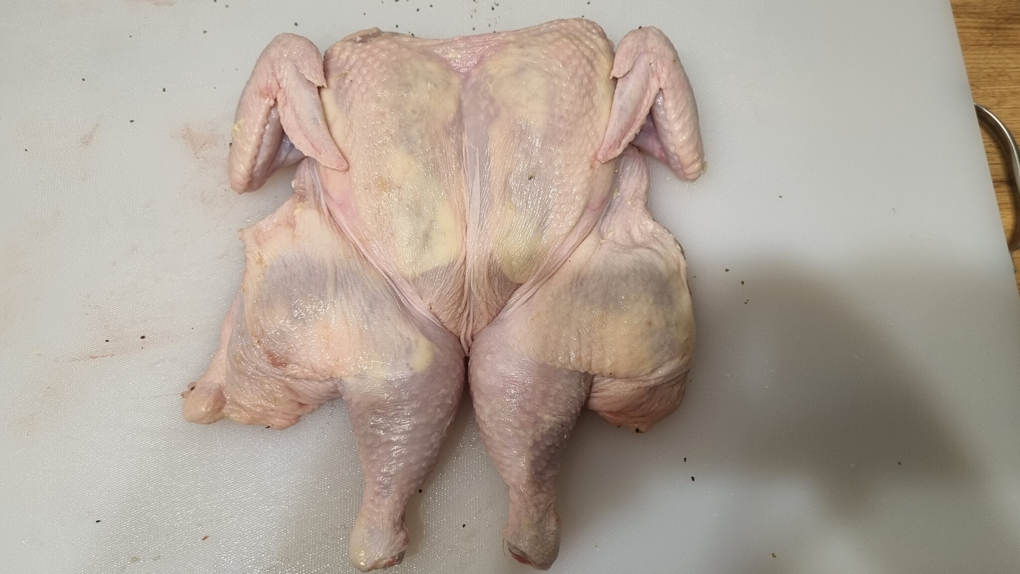 Общий вес курицы, после разделки составил 1575 грамм. Возьмем 0,75% соли от общего веса. То есть 12 грамм. 6 грамм рассыпаем по внутренней части и туда же добавляем 0,5 грамм черного дробленого перца.
