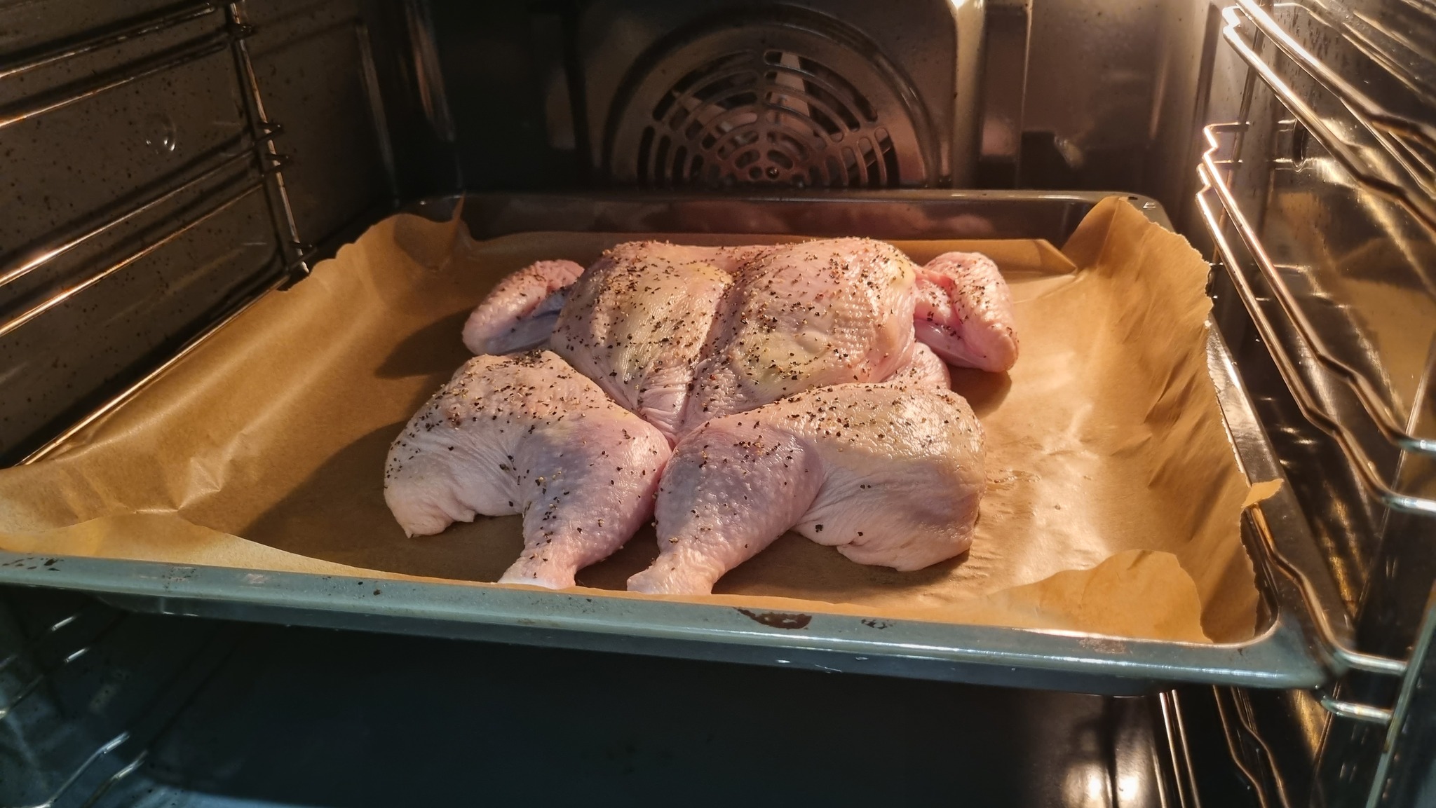 В противень пергамент, на пергамент курицу. Ножки вместе. Всё на средний ярус.