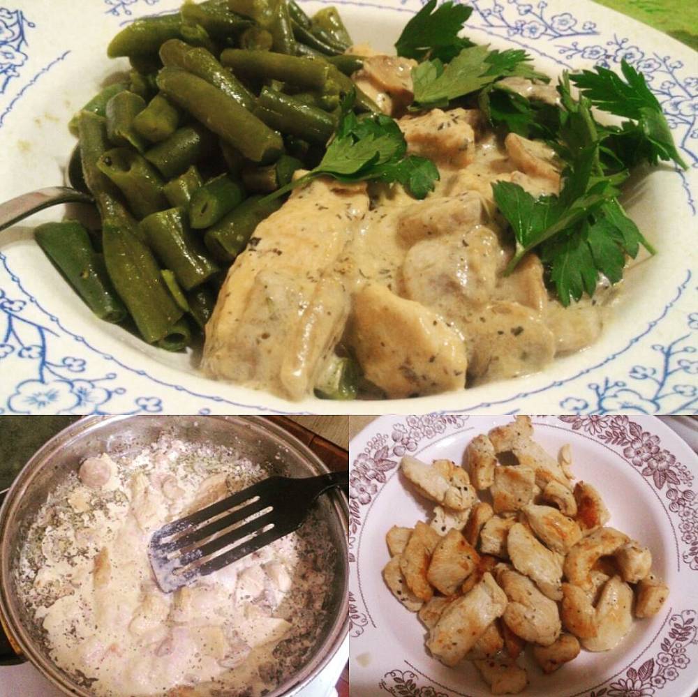 Выкладываем в соус куски курицы. Немного протушим их, накрыв крышкой, чтобы они напитались сливочным вкусом.