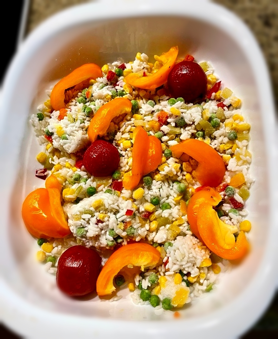 В форму для запекания высыпал пакет смеси овощной замороженной, гавайская которая, она с рисом, кстати. Покрошил перчик один, помидорок добавил. В принципе овощей можно добавить любых, которые нравятся.