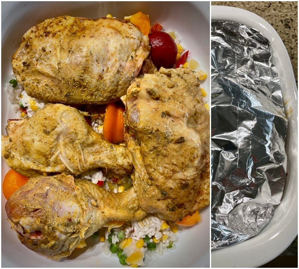Накрыл миску и в холодильник. У меня ночь и еще полдня простояла мисочка. Но хотя бы часик другой дайте курочке простоять, пропитаться.