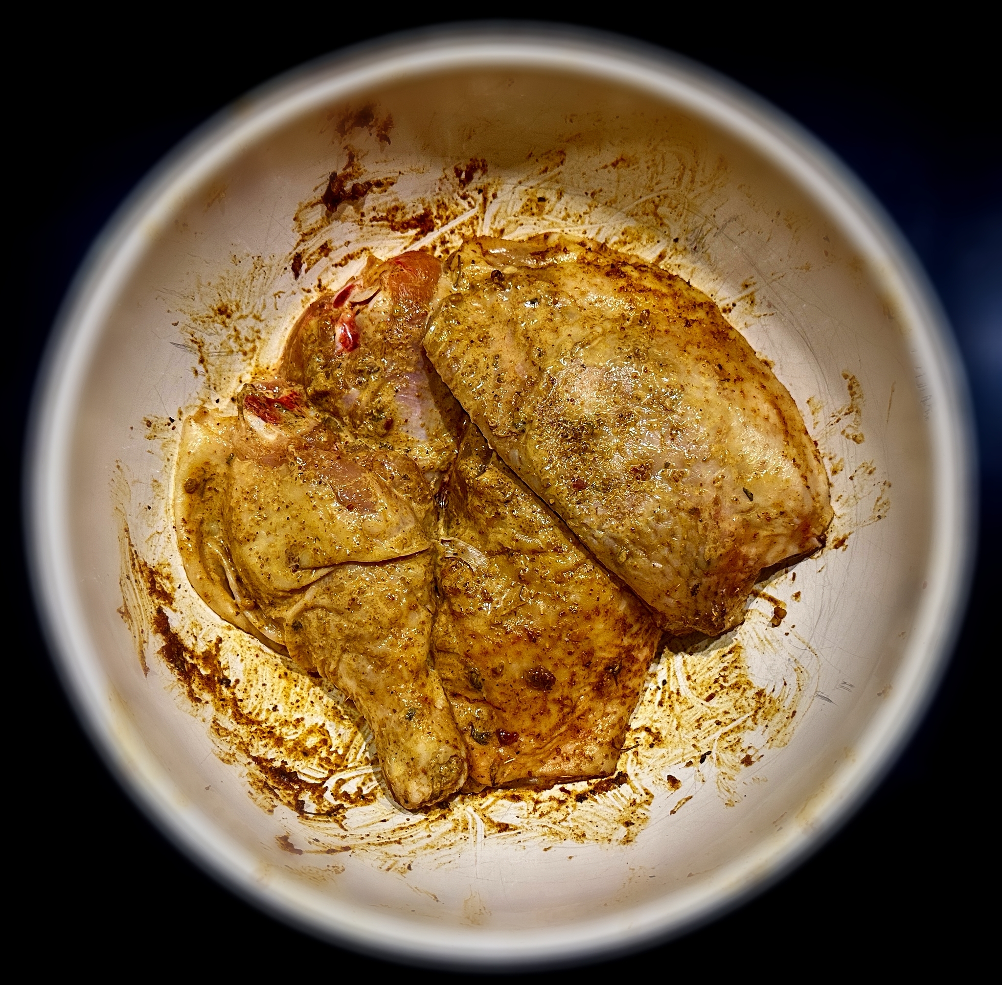Как следует, со всех сторон куски курицы обмазал, даже кое где, где позволила кожа заправил пасту ей под шкуру.