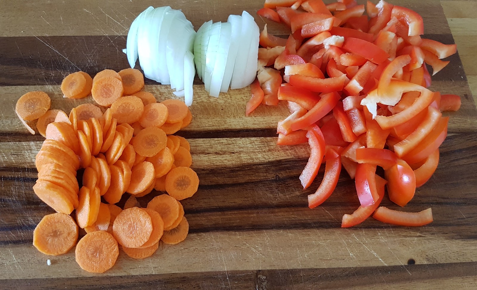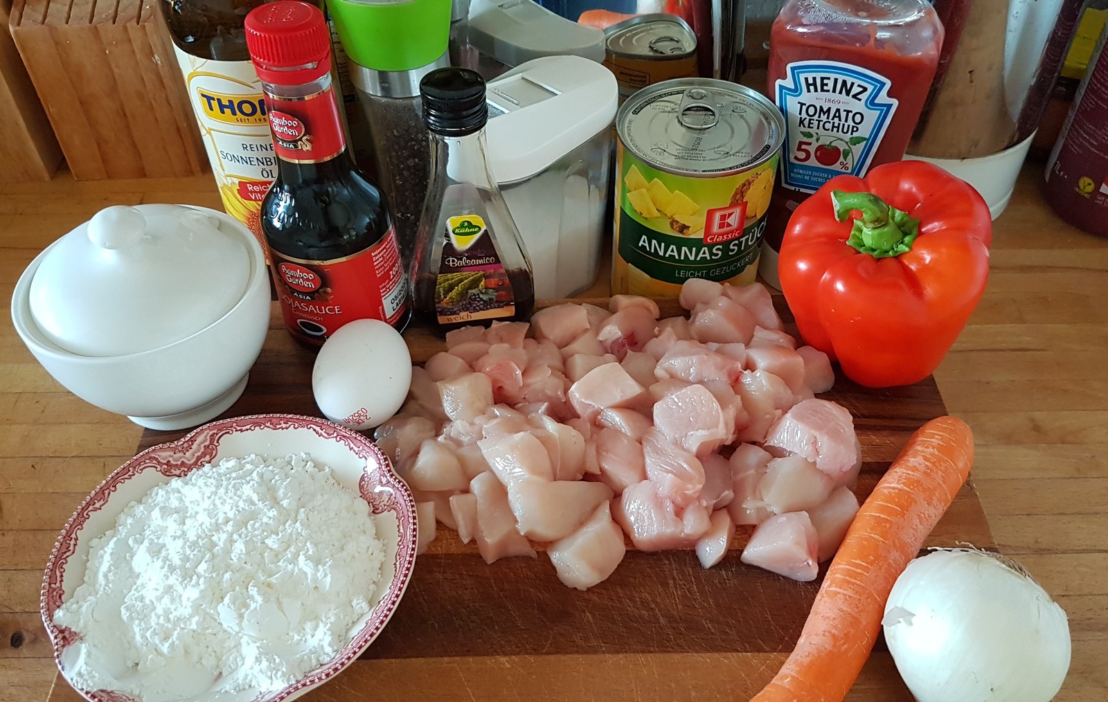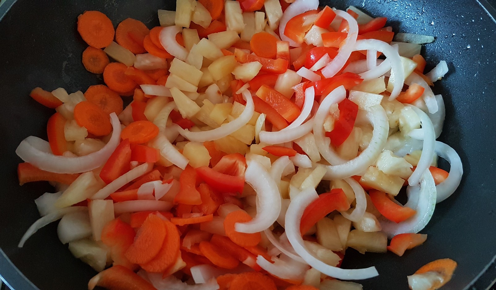 Пока готовится мясо, можно заняться овощами. Крупно режем лук, болгарский перец и морковку. В принципе, сюда можно добавить ещё массу всего: грибы, ростки бамбука, кабачок и даже капусту, но мне лень. Помним про ананасы, они тоже отправятся на сковородку. Обязательно слейте в отдельную тару сок из банки, он идёт в соус.