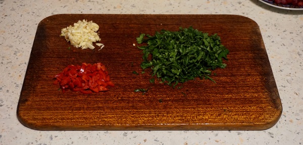 Ну что же, начнём! Для начала надо мелко нарезать чеснок, петрушку и перец чили.