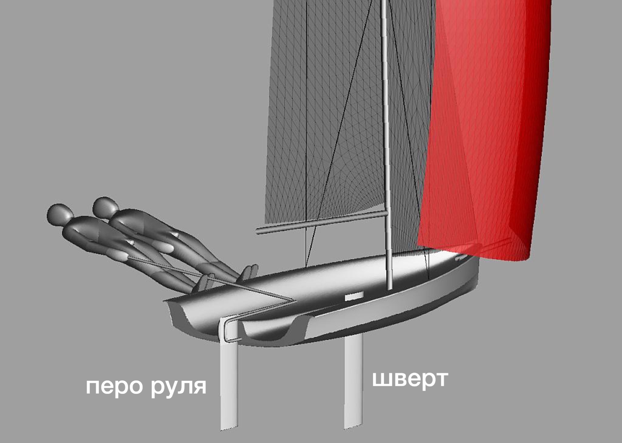 но на легких спортивных швертботах бульбы нет, есть только шверт - подьемный плавник, и чтобы швертбот не перевернулся, гонщики откренивают, вывешиваясь за борт, в ремнях или на трапеции.