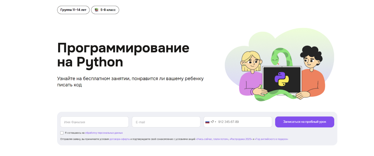 Форматы: курс «Питона» для школьников реализуется в группах и индивидуально. При желании можно отдать предпочтение самоучебе по материалам в записи.