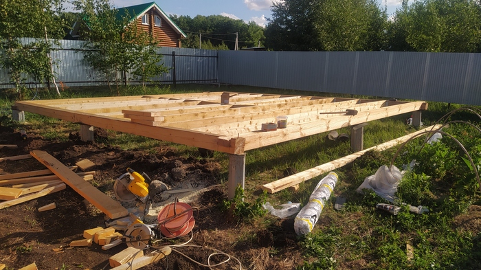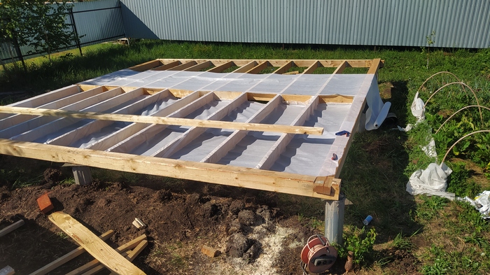 Утепленные полы готовы, приступаем к сборке каркаса. Самая легкая часть. Напилил, разложил, забил, поднял и закрепил. Пару часов и работа готова. И снова простите, отвлекаться и снимать ни времени ни желания не было, снимала супруга для своих целей, что нашел, то и выкладываю. Чукча не писатель и не фотограф, чукча строитель и читатель.