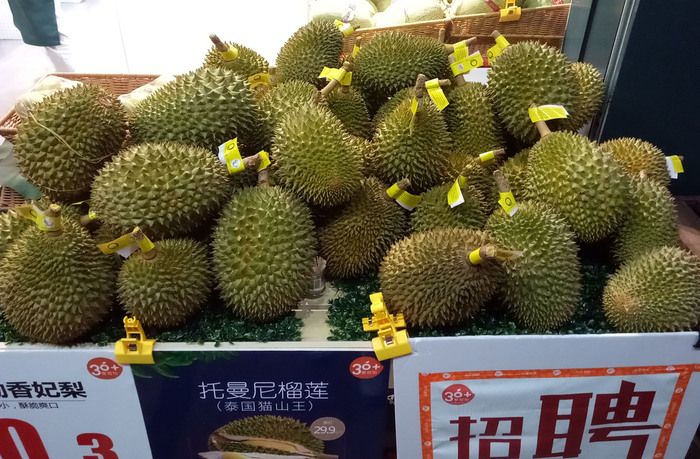 3. Дуриан. Да, том самый. Большой, вонючий, везде. Нет, правда. Из него делают пирожки, сладости и прочие штуки. Когда большой, не воняет, только при разделке. Дорогой. Взвешивают с кожурой, хотя бывают, продают только дольки, но китайцы любят только свежее, поэтому много выбрасывается. Внутри похож на светлый зелёный ещё каштан из множества долек и когда перегородки ещё мягкие. Если интересно, сделаю фото.