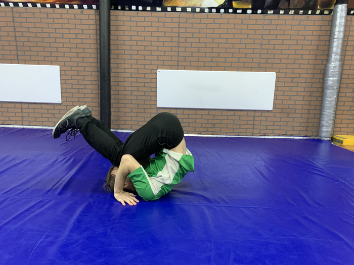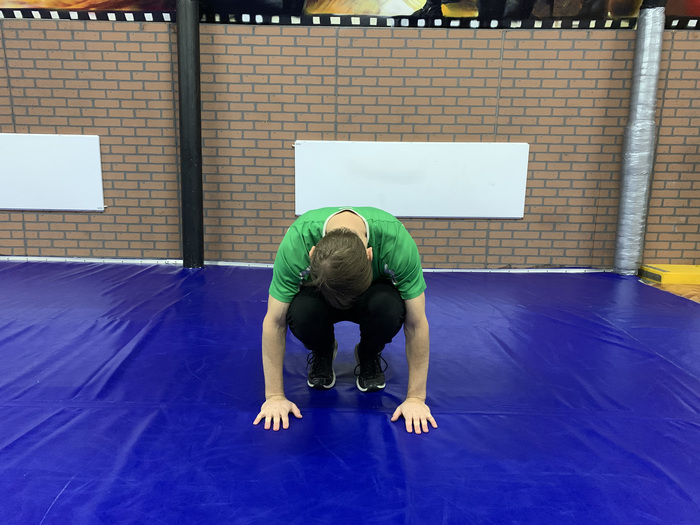 - в момент, когда опора перемещается на верхнюю часть спины, нужно руки из положения группировки перевести к голове и опереться ладонями на пол (руки рядом с головой);