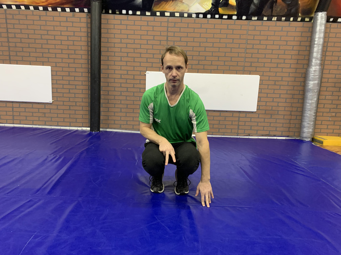 - из исходного положения упор присев выполняется перекат назад в группировке (правая рука держит правую ногу, левая – левую);