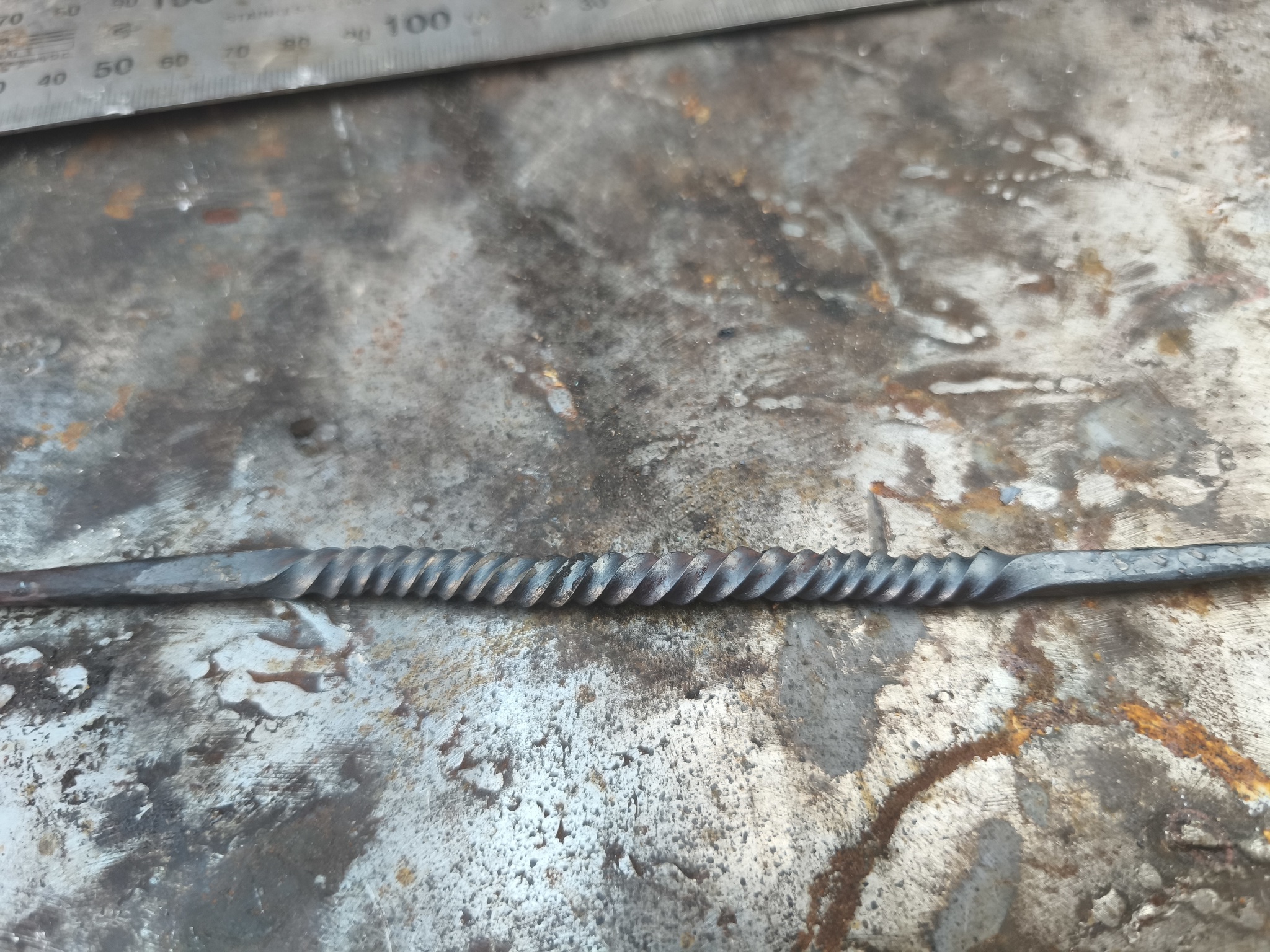 Сначала перековал обе заготовки до квадрата примерно 4 мм. Это стандартная операция - кузнецы делают круглое квадратным, а квадратное круглым) Кто-то скажет, что "слишком много работы" и будет прав, но сейчас цель - оттачивать технику работы молотком, а не "оптимизировать производство")