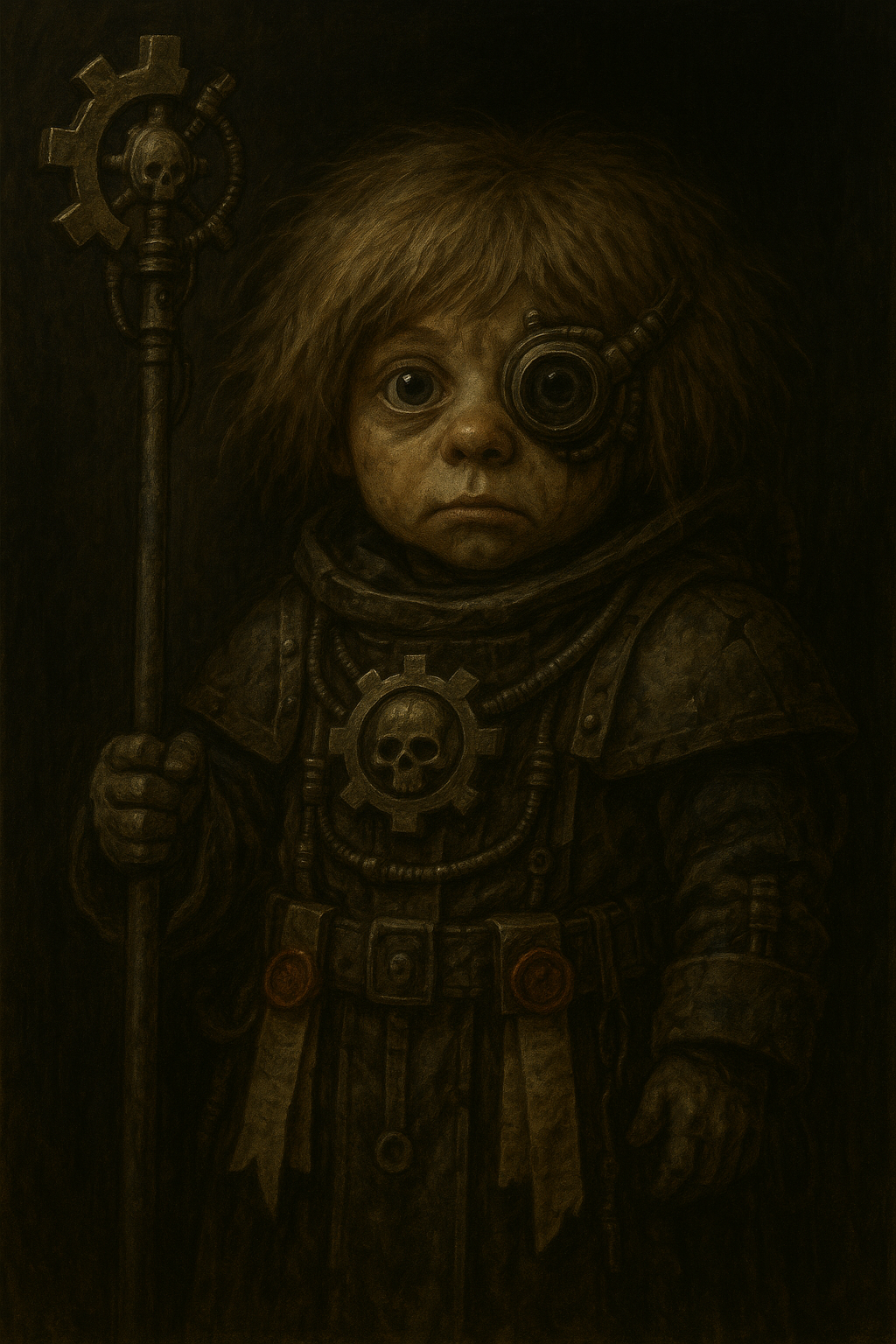 Кузя родился в руинах древнего Храма Машины. Едва научившись ходить, он уже собирал обломки священных механизмов, шепча заклинания Омниссии своим игрушечным шестерёнкам. Его знание машин не столько пришло из книг, сколько из наивного детского общения с духами железа.