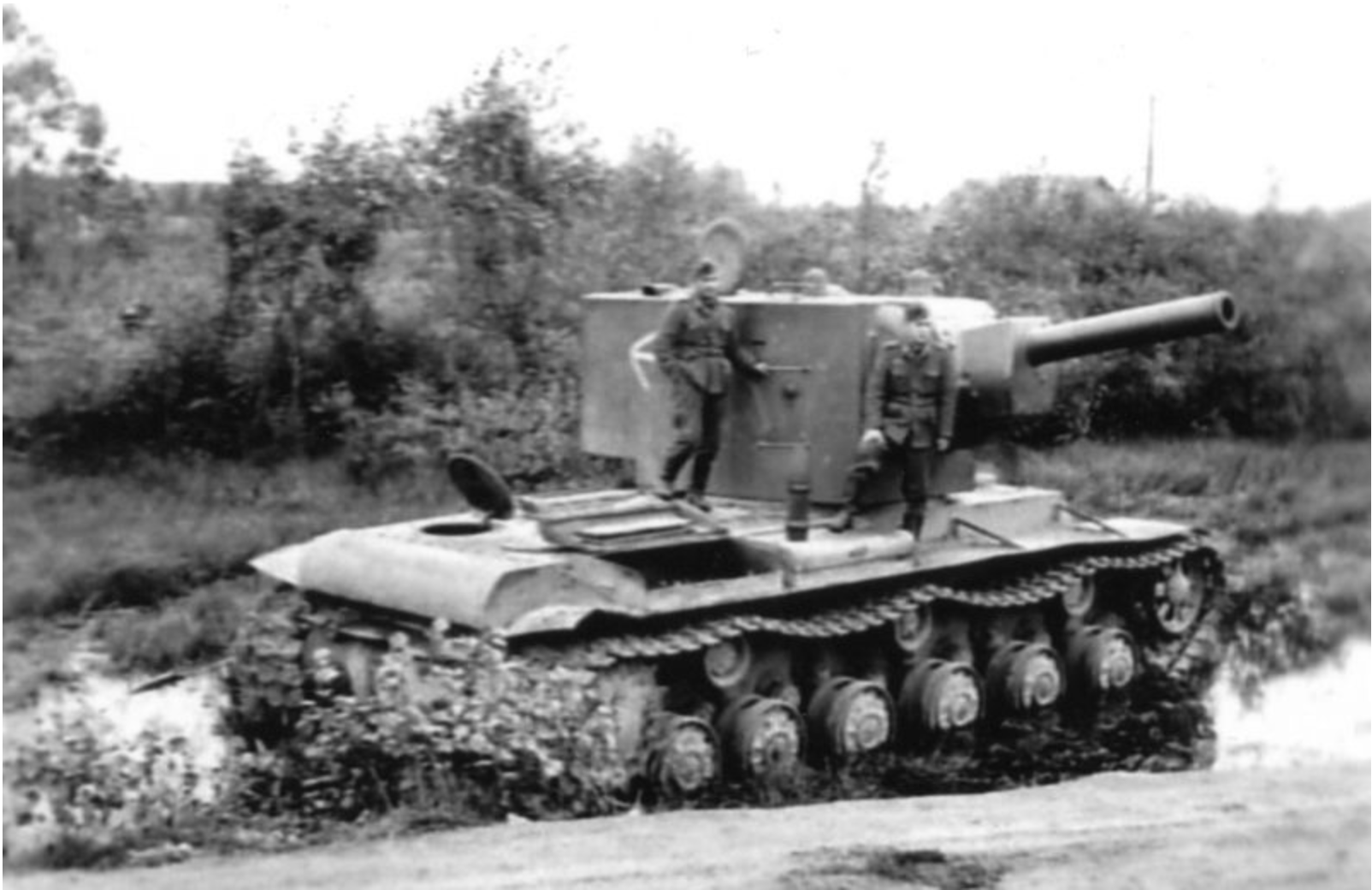 Брошенный советский тяжелый танк КВ-2 выпуска мая — июня 1941 года из 1-го танкового батальона, 27-го танкового полка 14-ой танковой дивизии 7-го механизированного корпуса 20-й армии Западного фронта
