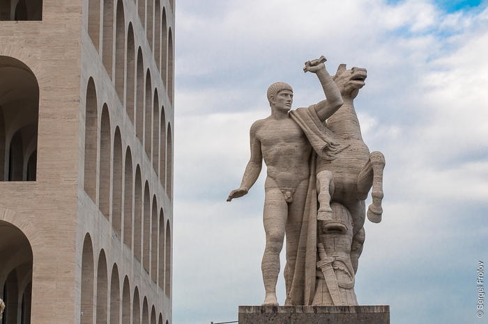 О традициях древнеримской архитектуры, помимо опоясывающих аркад, напоминают установленные по периметру Квадратного Колизея 28 аллегорических статуй, олицетворяющих различные сферы науки и искусства, а по углам дворца - скульптурные фигуры античных героев-близнецов Диоскуров, сыновей Зевса и Леды