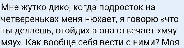 Меня это не волновало ровно до того момента когда моя племянница заразилась этой бредятиной. Не отрицаю, я тоже притворялась пони и скакала на четвереньках в 10-11 возрасте, но воспринималось это как игра и не более. Сейчас, когда посты с этими недозверями пищат из каждой группы, понимаешь масштаб проблемы. А самое главное эти "квадроберы" всеръёз воспринимают себя как животных(кошек, собак, лис, волков и т. д.). Ладно если бы эти зверо-детишки скакали у себя дома или в квартире, но это уже выливается в общество, что не норма, как ни крути. Я хочу думать, что это очередная мейнстримная херь, которая вскоре сбавит обороты.