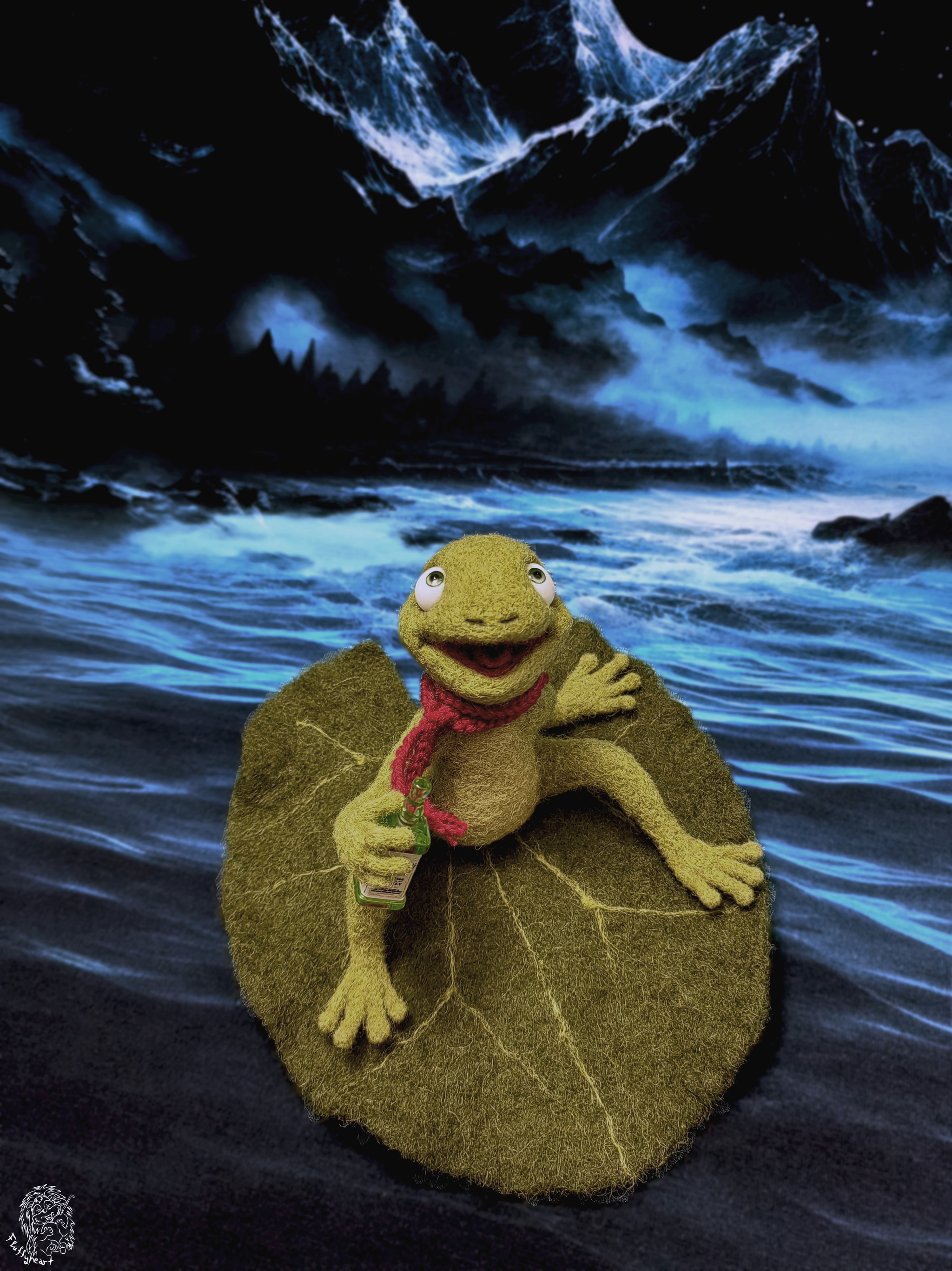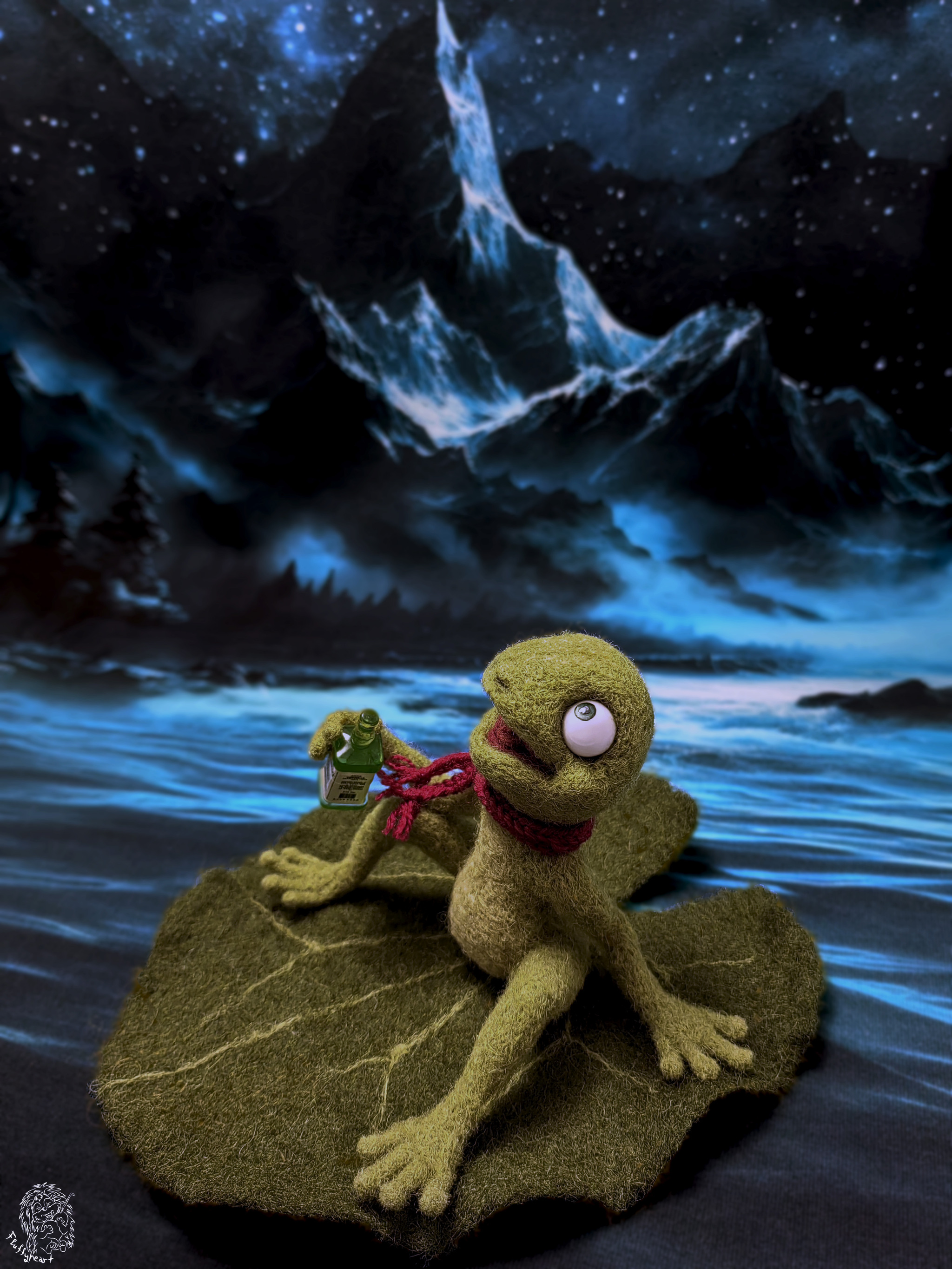 Лягушонок наконец-то решил выбраться из своего родного болота и поглазеть на необъятное ночное небо и мерцающие звезды над морем. Ну а бутылка зеленого виски "Жаб Дэниэлс" и шарфик - исключительно для согрева хрупкого организма.