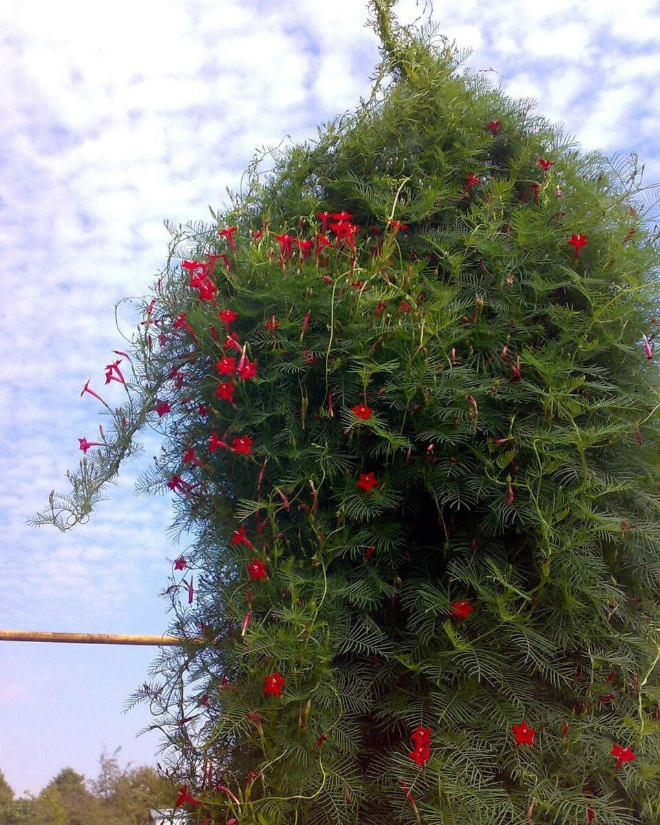 Квамоклит перистый — однолетняя лиана семейства Вьюнковые. Родом из тропических районов Центральной Америки, он с лёгкой руки садоводов-энтузиастов распространился по всему миру. В странах с мягким климатом его выращивают как многолетник, но в условиях средней полосы России растение не переносит морозов и выращивается как однолетнее — каждый сезон заново из семян.