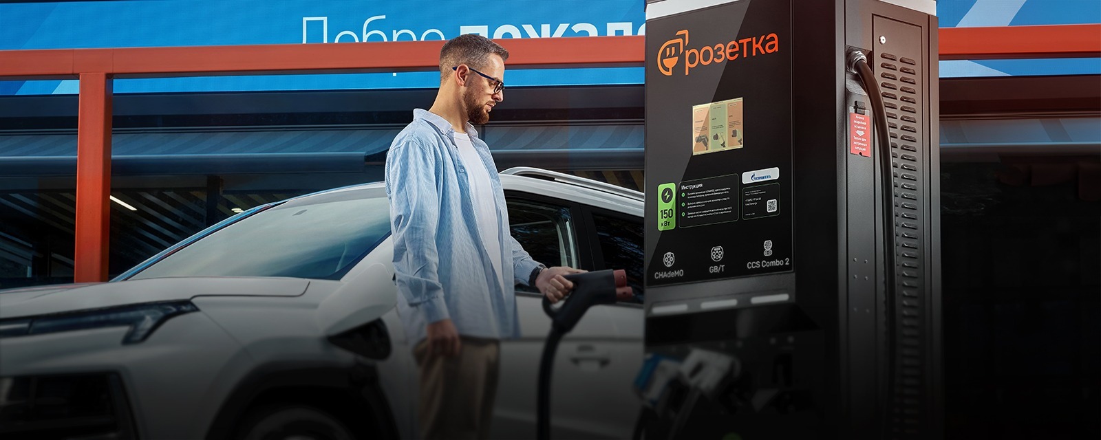 Водитель заряжает электромобиль на быстрой зарядной станции бренда «Розетка»