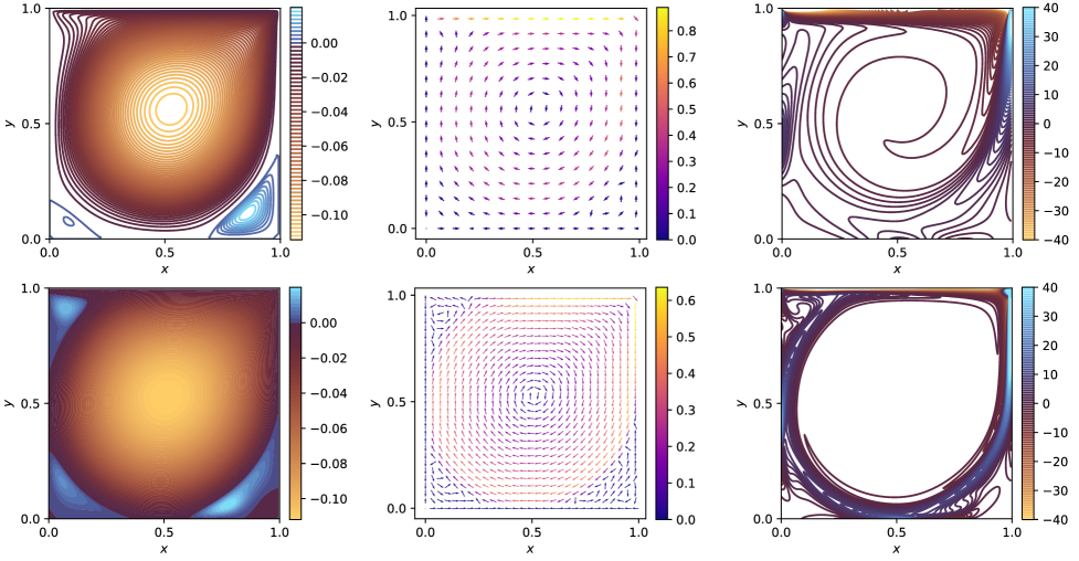 При моделировании полости с крышкой, управляемой крышкой, на сетке 128 × 128 при Re = 1000 и на сетке 256 × 256 при Re = 10000 в установившемся состоянии, анализ функций тока ψ, полей скорости u=(u,v) и вихря ω демонстрирует соответствие результатов, полученных с использованием бозонного симулятора и эволюции по правилу Эйлера, расчетам DNS.