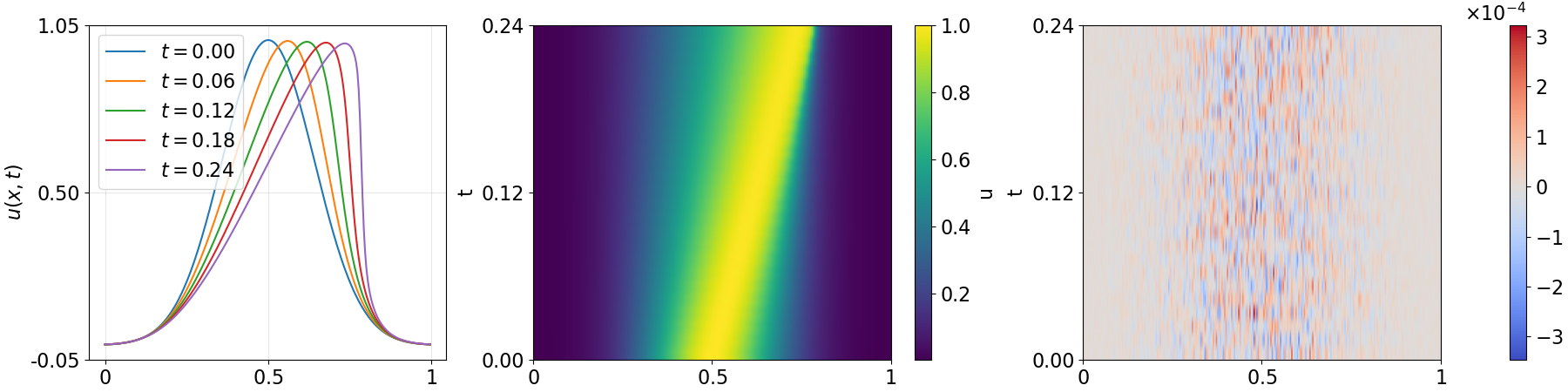 При валидации одномерного уравнения Бюргерса наблюдается смещение профилей решения вправо со скоростью, определяемой u, нелинейное усиление за счет адвективного члена -u (∂ u)⁄(∂ x) и диффузное сглаживание, вызванное (1)⁄(R_e) (∂² u)⁄(∂ x²), при этом карта u(x,t) во временном окне демонстрирует преобладающий правосторонний дрейф со слабым вязким распространением, а систематическая ошибка, рассчитанная с использованием N = 10⁴ снимков на точку сетки, центрирована вокруг нуля и пространственно неструктурирована, что соответствует предсказанию о постоянстве и независимости от времени дисперсии Var_j(t) первого порядка [уравнение (73)].