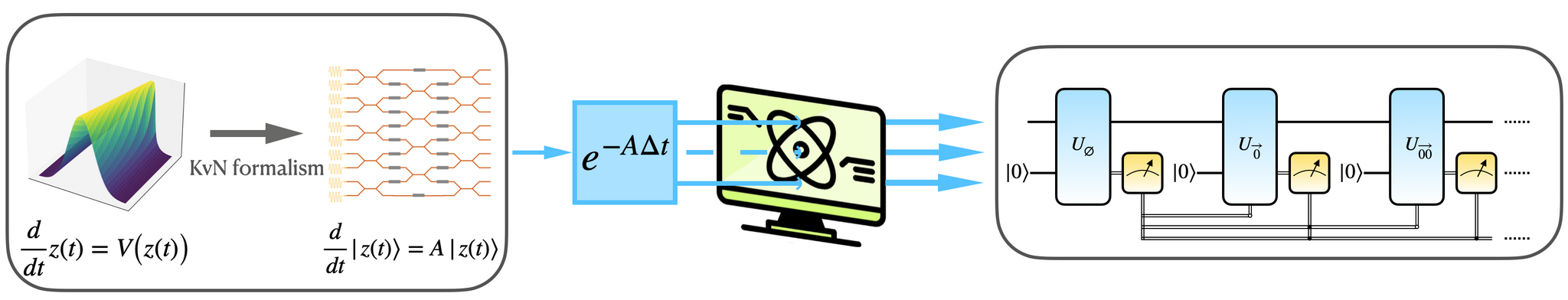Алгоритм квантовых вычислений с непрерывными переменными преобразует нелинейную эволюцию поля, описываемую уравнением z˙=V(z(t)), в линейную операцию посредством преобразования KvN, реализуемого на расширенном пространстве оператором AA, а каждый шаг этого процесса воплощается в виде локального CPTP-отображения K_a=e−AΔt, действующего на мультимодальные когерентные состояния, что позволяет компилировать алгоритм в логистически эффективную, измеряемую бинарную схему с глубиной, зависящей от ранга Крауса, и последующей постселекцией состояния |0⟩.